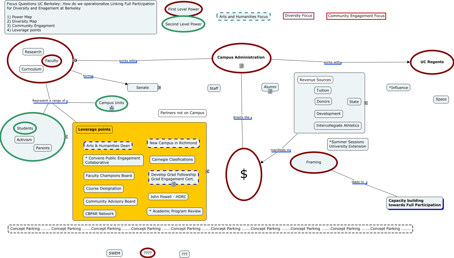 This Concept Map, created with IHMC CmapTools, has information related to: Berkeley, Faculty forms Senate, Campus Administration directs the $, Framing leads to Capacity building towards Full Participation, Students Represent a range of Leverage Points, Campus Units Represent a range of Leverage Points, Campus Administration works with Faculty, Campus Administration works with UC Regents, Key Revenue Sources manifests in $, Faculty Represent a range of Leverage Points