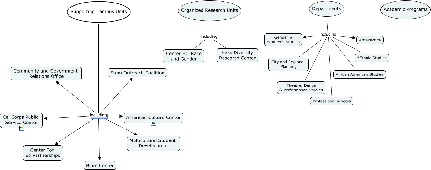 This Concept Map, created with IHMC CmapTools, has information related to: Campus Units, Departments including Professional schools, Supporting Campus Units including Stem Outreach Coalition, Supporting Campus Units including Center For Ed Partnerships, Supporting Campus Units including Multicultural Student Develeopmnt, Organized Research Units including Center For Race and Gender, Departments including Art Practice, Supporting Campus Units including Community and Government Relations Office, Departments including African American Studies, Supporting Campus Units including American Culture Center, Supporting Campus Units including Cal Corps Public Service Center, Departments including Gender & Women's Studies, Departments including City and Regional Planning, Supporting Campus Units including Blum Center, Organized Research Units including Hass Diversity Research Center, Departments including *Ethnic Studies, Departments including Theatre, Dance & Performance Studies