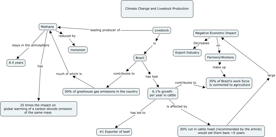 This Concept Map, created with IHMC CmapTools, has information related to: fantastic 4 2, Livestock leading producer of Methane, 6.1% growth per year in cattle has led to #1 Exporter of beef, 50% of greehouse gas emissions in the country much of which is Methane, Methane stays in the atmosphere 8.4 years, 6.1% growth per year in cattle contributes to 35% of Brazil's work force is connected to agriculture, Negative Economic Impact on Farmers/Workers, Methane reduced by monensin, Livestock in Brazil, Farmers/Workers make up 35% of Brazil's work force is connected to agriculture, 6.1% growth per year in cattle is affected by 30% cut in cattle head (recommended by the article) would set them back ~5 years, Brazil has had 6.1% growth per year in cattle, Brazil contributes to 50% of greehouse gas emissions in the country, 30% cut in cattle head (recommended by the article) would set them back ~5 years large Negative Economic Impact, Negative Economic Impact Decreases Export Industry, Methane has 25 times the impact on global warming of a carbon dioxide emission of the same mass