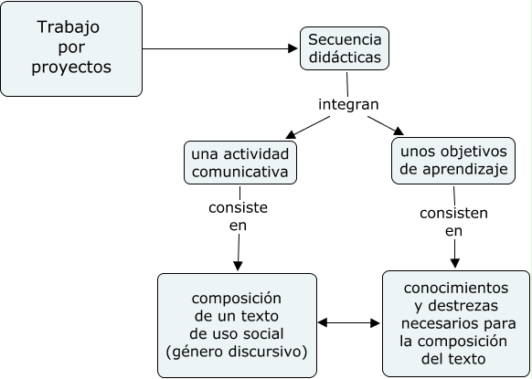 Este Cmap, tiene información relacionada con: Proyectos de lengua, Trabajo por proyectos ???? Secuencia didácticas, Secuencia didácticas integran una actividad comunicativa, composición de un texto de uso social (género discursivo) ???? conocimientos y destrezas necesarios para la composición del texto, unos objetivos de aprendizaje consisten en conocimientos y destrezas necesarios para la composición del texto, una actividad comunicativa consiste en composición de un texto de uso social (género discursivo), Secuencia didácticas integran unos objetivos de aprendizaje