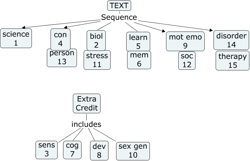This Concept Map, created with IHMC CmapTools, has information related to: Course Map, Extra Credit includes cog 7, TEXT Sequence science 1, Extra Credit includes sens 3, Extra Credit includes sex gen 10, TEXT Sequence biol 2, TEXT Sequence mot emo 9, TEXT Sequence learn 5, Extra Credit includes dev 8, TEXT Sequence disorder 14, TEXT Sequence con 4