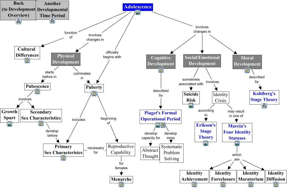 Adolescence-gram, Marcia's Four Identity Statuses which are Identity Diffusion, Pubescence involves Growth Spurt, Puberty includes Primary Sex Characteristcs, Piaget's Formal Operational Period develop more Systematic Problem Solving, Primary Sex Characteristcs necessary for Reproductive Capability, Adolescence involves changes in Social/Emotional Development, Adolescence involves changes in Moral Development, Secondary Sex Characteristics develop before Primary Sex Characteristcs, Adolescence officially begins with Puberty, Marcia's Four Identity Statuses which are Identity Moratorium