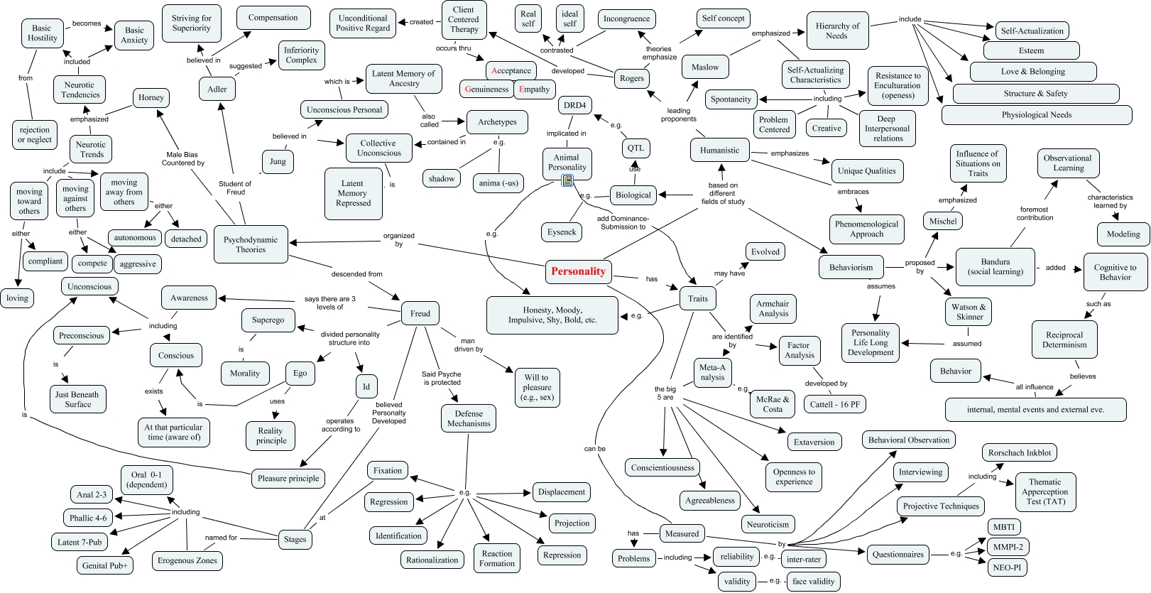 This Concept Map, created with IHMC CmapTools, has information related to: personality, Traits the big 5 are Openness to experience, Incongruence contrasted ideal self, Meta-A nalysis e.g. McRae & Costa, Meta-A nalysis the big 5 are Neuroticism, Defense Mechanisms e.g. Fixation, Freud man driven by Will to pleasure (e.g., sex), Projective Techniques including Rorschach Inkblot, Psychodynamic Theories descended from Freud, Neurotic Tendencies included Basic Hostility, Meta-A nalysis the big 5 are Openness to experience, Measured by Interviewing, Hierarchy of Needs include Self-Actualization, Psychodynamic Theories Student of Freud Jung, Traits are identified by Armchair Analysis, Awareness including Conscious, Client Centered Therapy occurs thru Acceptance, Meta-A nalysis the big 5 are Conscientiousness, Traits the big 5 are Agreeableness, Maslow emphasized Self-Actualizing Characteristics, Stages including Genital Pub+