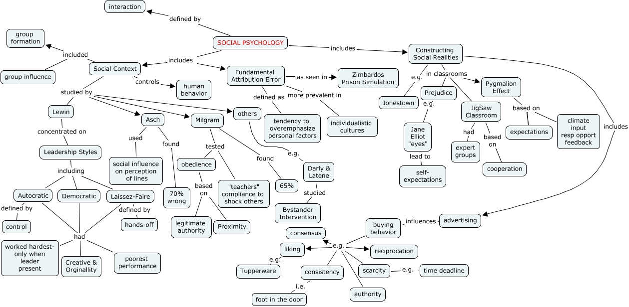 This Concept Map, created with IHMC CmapTools, has information related to: Social Psychology (Zimbardo Social Influence), buying behavior e.g. consensus, SOCIAL PSYCHOLOGY defined by interaction, Lewin concentrated on Leadership Styles, Fundamental Attribution Error defined as tendency to overemphasize personal factors, Asch found 70% wrong, buying behavior e.g. consistency, Leadership Styles including Autocratic, Constructing Social Realities e.g. Jonestown, Social Context included group formation, Laissez-Faire defined by hands-off, buying behavior e.g. scarcity, Darly & Latene studied Bystander Intervention, Asch used social influence on perception of lines, Laissez-Faire had Creative & Orginallity, Fundamental Attribution Error more prevalent in individualistic cultures, Autocratic had worked hardest- only when leader present, Jane Elliot "eyes" lead to self- expectations, Pygmalion Effect based on climate input resp opport feedback, obedience based on Proximity, scarcity e.g. time deadline