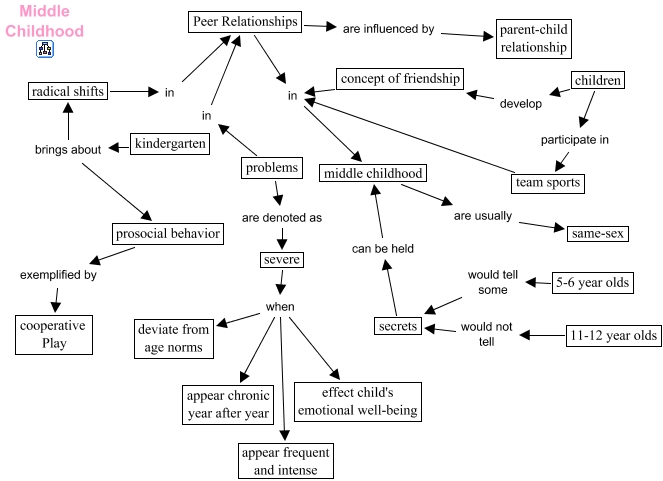Peer relationships - middle childhood, Peer Relationships are influenced by parent-child relationship, prosocial behavior exemplified by cooperative Play, children develop concept of friendship, radical shifts in Peer Relationships, 11-12 year olds would not tell secrets, Peer Relationships in middle childhood, problems in Peer Relationships, severe when effect child's emotional well-being, problems are denoted as severe, 5-6 year olds would tell some secrets