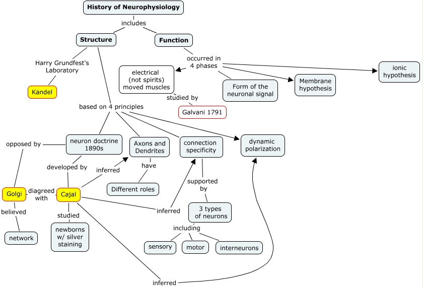History of Neurophysiology, neuron doctrine 1890s developed by Cajal, Function occurred in 4 phases ionic hypothesis, connection specificity supported by 3 types of neurons, Structure Harry Grundfest's Laboratory Kandel, Function occurred in 4 phases Membrane hypothesis, History of Neurophysiology includes Function, Structure based on 4 principles neuron doctrine 1890s, 3 types of neurons including motor, Axons and Dendrites have Different roles, 3 types of neurons including sensory