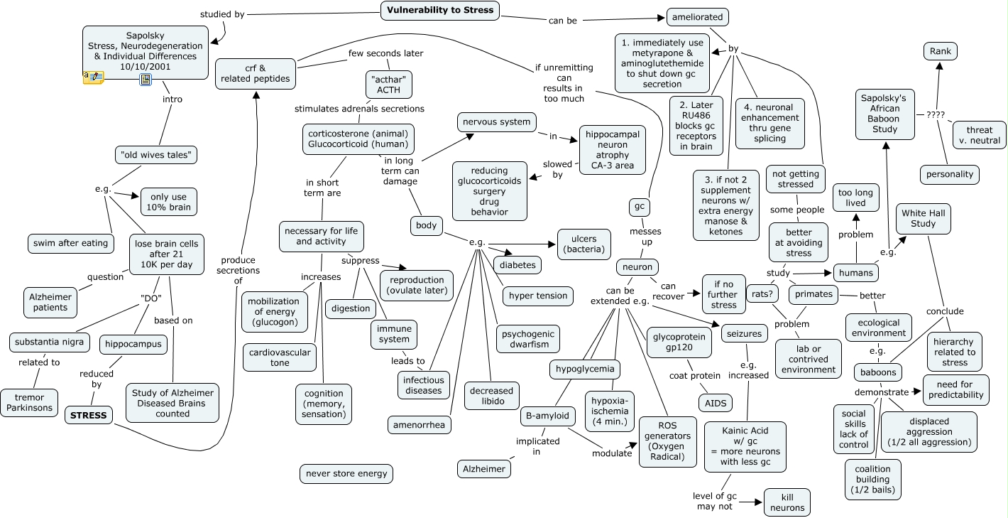 This Concept Map, created with IHMC CmapTools, has information related to: Sapolsky Stress, Neurodegeneration Rev 1, body e.g. infectious diseases, neuron can be extended e.g. hypoxia- ischemia (4 min.), "old wives tales" e.g. swim after eating, Sapolsky's African Baboon Study ???? threat v. neutral, Kainic Acid w/ gc = more neurons with less gc level of gc may not kill neurons, body e.g. diabetes, humans problem too long lived, lose brain cells after 21 10K per day based on Study of Alzheimer Diseased Brains counted, STRESS produce secretions of crf & related peptides, Sapolsky's African Baboon Study ???? Rank, baboons demonstrate displaced aggression (1/2 all aggression), Sapolsky Stress, Neurodegeneration & Individual Differences 10/10/2001 intro "old wives tales", necessary for life and activity increases cognition (memory, sensation), "old wives tales" e.g. lose brain cells after 21 10K per day, humans e.g. White Hall Study, ecological environment e.g. baboons, corticosterone (animal) Glucocorticoid (human) in short term are necessary for life and activity, body e.g. amenorrhea, primates better ecological environment, Sapolsky's African Baboon Study ???? personality