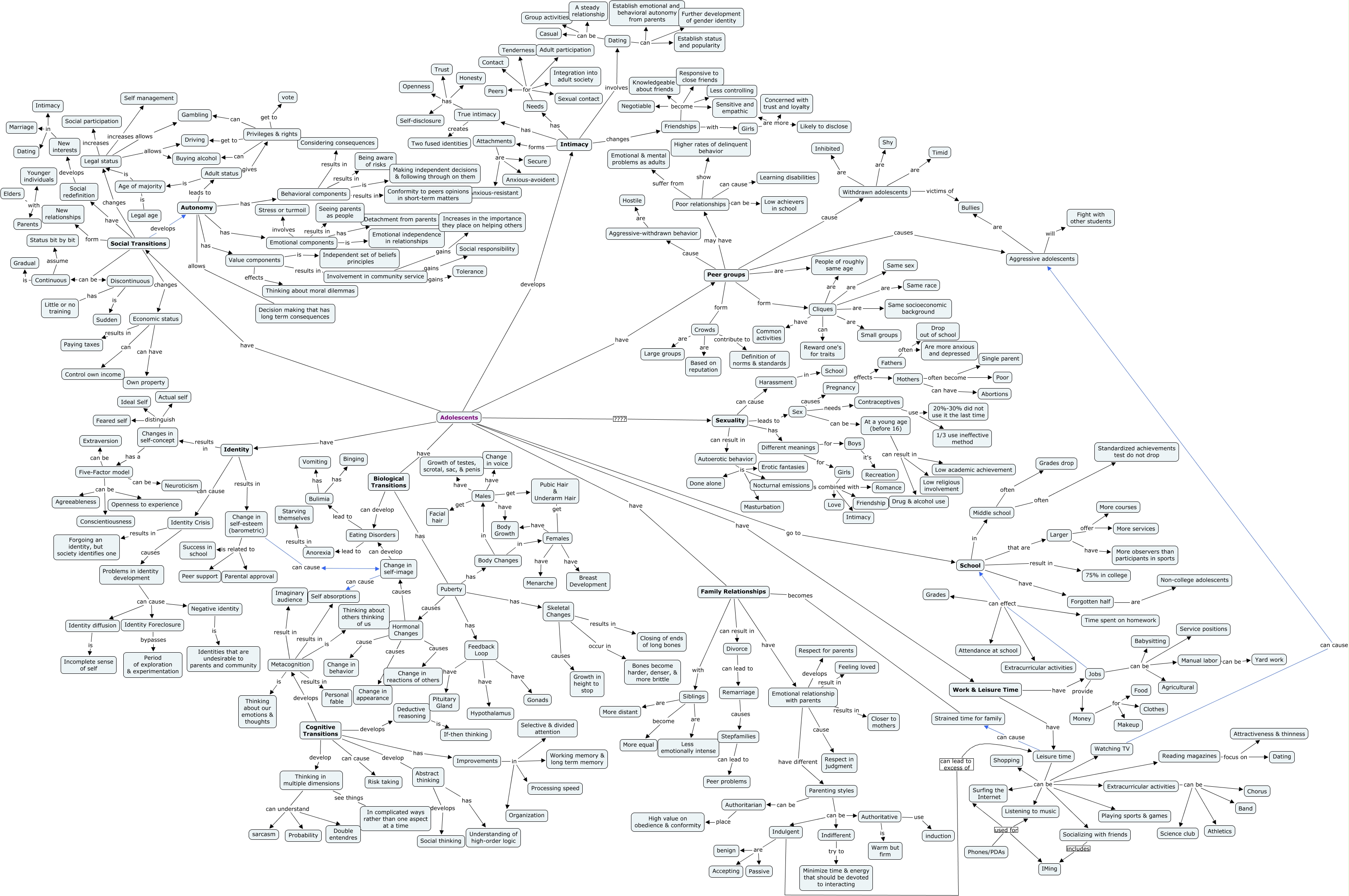 Adolescence, Adult status is Age of majority, Emotional components has Detachment from parents, Crowds contribute to Definition of norms & standards, Sexuality has Different meanings, Legal status allows Gambling, Privileges & rights can Buying alcohol, Problems in identity development can cause Identity diffusion, School result in 75% in college, Different meanings for Girls, Social Transitions develops Autonomy