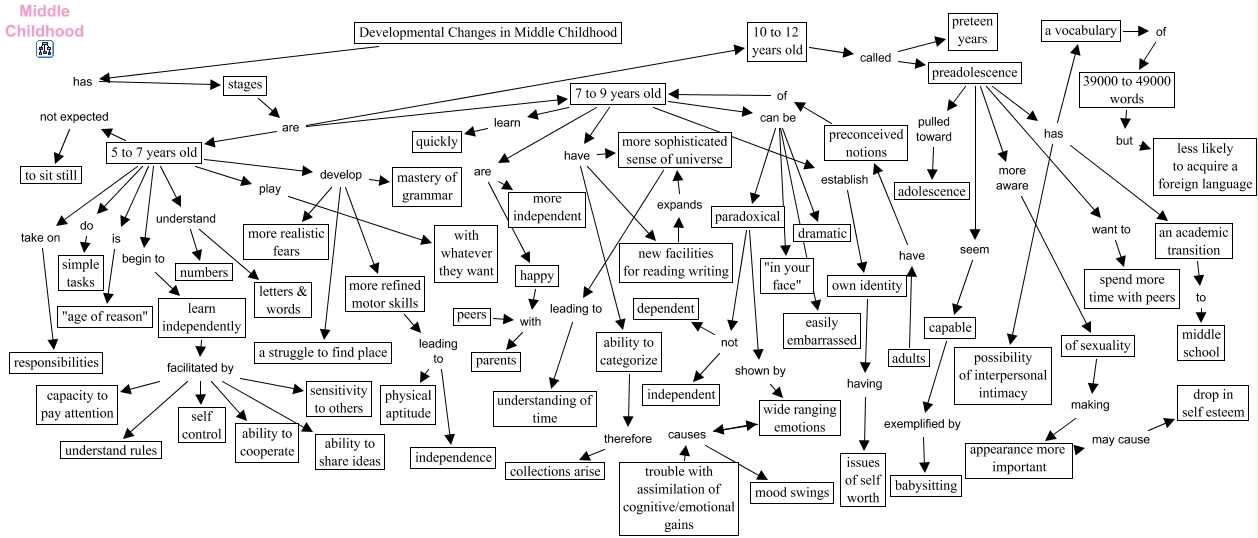 development changes, 7 to 9 years old are more independent, appearance more important may cause drop in self esteem, 7 to 9 years old have ability to categorize, 7 to 9 years old can be paradoxical, Developmental Changes in Middle Childhood has stages, 5 to 7 years old understand letters & words, wide ranging emotions causes mood swings, 5 to 7 years old understand numbers, learn independently facilitated by ability to cooperate, happy with parents