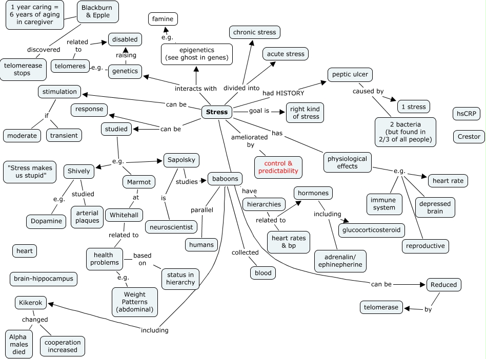 Stress (Nat Geo), peptic ulcer caused by 1 stress, telomeres related to disabled, Stress can be Reduced, health problems e.g. Weight Patterns (abdominal), hormones including glucocorticosteroid, studied e.g. Sapolsky, studied e.g. Marmot, Stress had HISTORY peptic ulcer, studied e.g. Shively, Stress can be studied