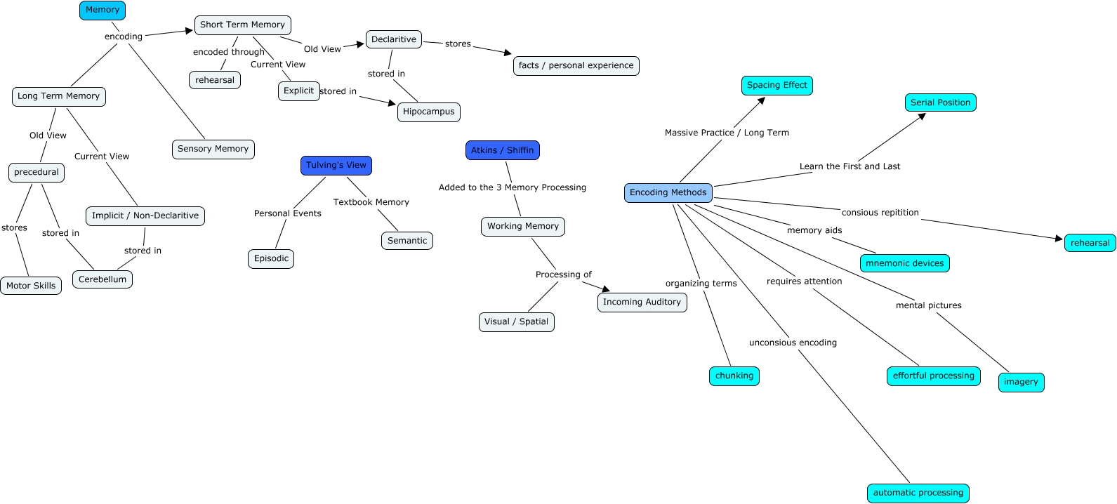 This Concept Map, created with IHMC CmapTools, has information related to: Folder to be scored - Ronald Ware, Encoding Methods unconsious encoding automatic processing, precedural stored in Cerebellum, Implicit / Non-Declaritive stored in Cerebellum, Encoding Methods Learn the First and Last Serial Position, Declaritive stores facts / personal experience, Memory encoding Sensory Memory, Working Memory Processing of Visual / Spatial, Long Term Memory Current View Implicit / Non-Declaritive, Short Term Memory Current View Explicit, Working Memory Processing of Incoming Auditory, Encoding Methods requires attention effortful processing, Tulving's View Personal Events Episodic, Atkins / Shiffin Added to the 3 Memory Processing Working Memory, Memory encoding Short Term Memory, Tulving's View Textbook Memory Semantic, Encoding Methods consious repitition rehearsal, Encoding Methods Massive Practice / Long Term Spacing Effect, Encoding Methods mental pictures imagery, Memory encoding Long Term Memory, Explicit stored in Hipocampus