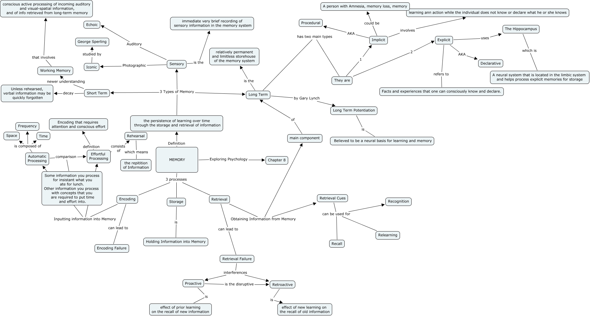 This Concept Map, created with IHMC CmapTools, has information related to: Folder to be graded-Kwamae Simpkins, MEMORY 3 processes Encoding, Long Term Potentiation is Believed to be a neural basis for learning and memory, Rehearsal which means the repitition of Information, Explicit refers to Facts and experiences that one can consciously know and declare., Retrieval Obtaining Information from Memory Retrieval Cues, Retrieval can lead to Retrieval Failure, Automatic Processing is composed of Space, Retrieval Failure interferences Proactive, Long Term by Gary Lynch Long Term Potentiation, the persistence of learning over time through the storage and retrieval of information 3 Types of Memory Sensory, Encoding Inputting information into Memory Automatic Processing, Automatic Processing is composed of Frequency, main component of Long Term, Implicit could be A person with Amnesia, memory loss, memory, Sensory Photographic Iconic, Iconic studied by George Sperling, Proactive is the disruptive Retroactive, Effortful Processing consists of Rehearsal, They are 2 Explicit, The Hippocampus which is A neural system that is located in the limbic system and helps process explicit memories for storage