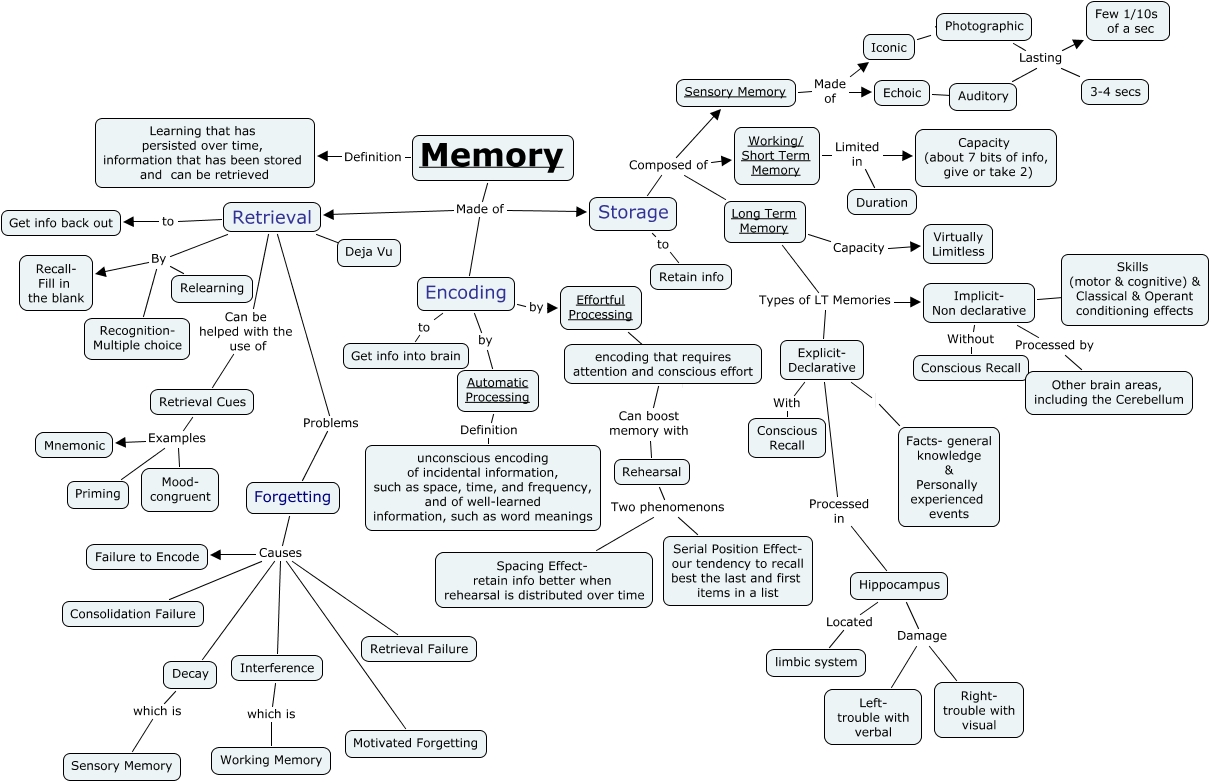 This Concept Map, created with IHMC CmapTools, has information related to: Folder to be scored-Brittany McNair Mem Map, Long Term Memory Types of LT Memories Explicit- Declarative, Sensory Memory Made of Iconic, Retrieval By Recall- Fill in the blank, Storage Composed of Long Term Memory, Long Term Memory Capacity Virtually Limitless, Retrieval to Get info back out, Auditory Lasting 3-4 secs, Retrieval Problems Forgetting, Forgetting Causes Failure to Encode, Rehearsal Two phenomenons Spacing Effect- retain info better when rehearsal is distributed over time, Memory Made of Encoding, Retrieval Cues Examples Mood- congruent, Implicit- Non declarative Processed by Other brain areas, including the Cerebellum, Storage Composed of Sensory Memory, Memory Made of Storage, Iconic ???? Photographic, Encoding by Effortful Processing, Explicit- Declarative Facts- general knowledge & Personally experienced events, Working/ Short Term Memory Limited in Duration, Retrieval kj Deja Vu