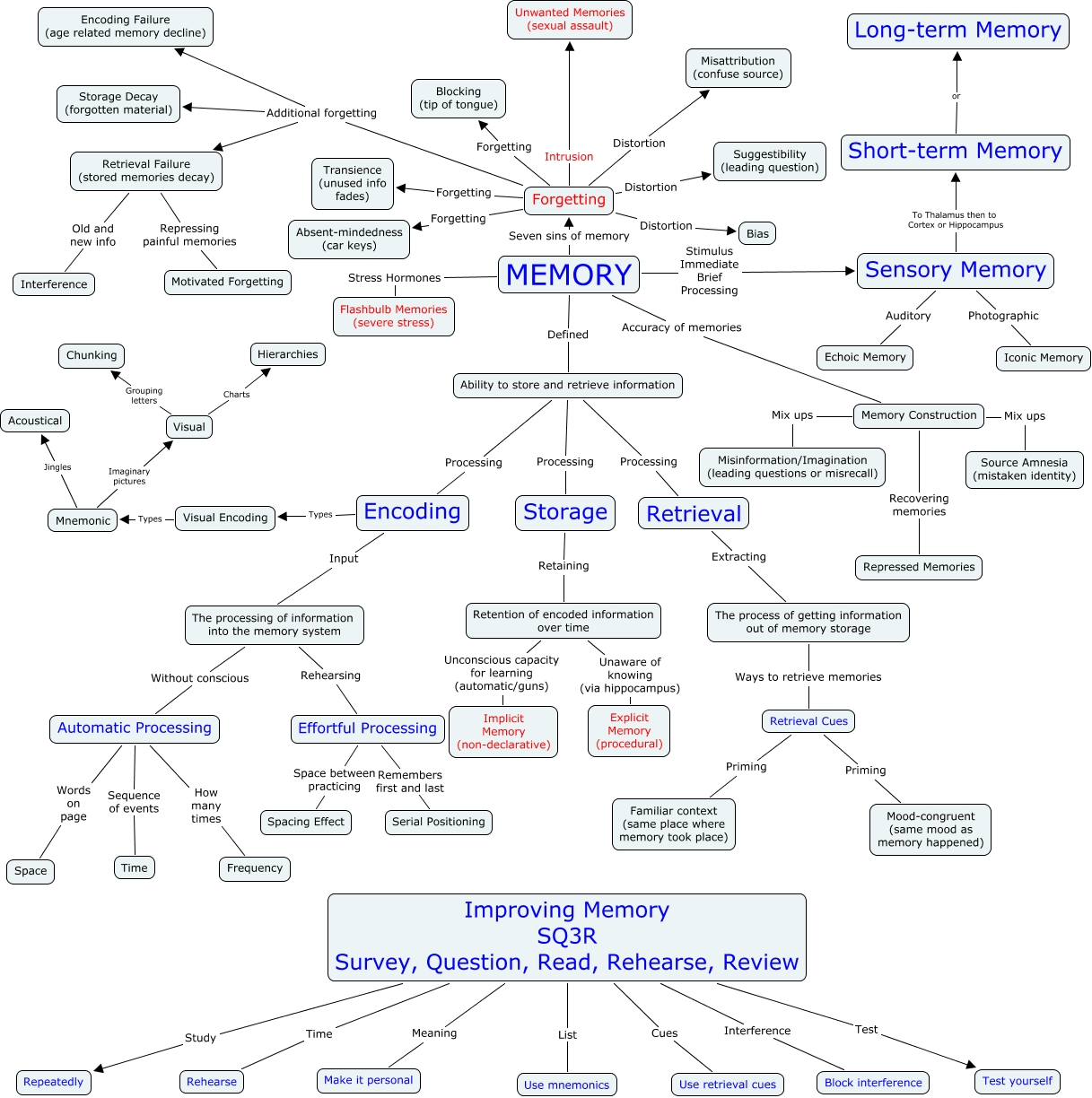This Concept Map, created with IHMC CmapTools, has information related to: Folder to be scored- Lyn Miller, Forgetting Forgetting Absent-mindedness (car keys), Retrieval Extracting The process of getting information out of memory storage, Retrieval Cues Priming Mood-congruent (same mood as memory happened), Forgetting Distortion Suggestibility (leading question), Forgetting Forgetting Blocking (tip of tongue), Improving Memory SQ3R Survey, Question, Read, Rehearse, Review Study Repeatedly, Forgetting Distortion Misattribution (confuse source), Retrieval Failure (stored memories decay) Repressing painful memories Motivated Forgetting, Forgetting Additional forgetting Retrieval Failure (stored memories decay), Mnemonic Jingles Acoustical, Short-term Memory or Long-term Memory, Memory Construction Recovering memories Repressed Memories, Automatic Processing Sequence of events Time, Sensory Memory Photographic Iconic Memory, MEMORY Accuracy of memories Memory Construction, Effortful Processing Space between practicing Spacing Effect, MEMORY Stress Hormones Flashbulb Memories (severe stress), Improving Memory SQ3R Survey, Question, Read, Rehearse, Review List Use mnemonics, Memory Construction Mix ups Misinformation/Imagination (leading questions or misrecall), Retention of encoded information over time Unconscious capacity for learning (automatic/guns) Implicit Memory (non-declarative)