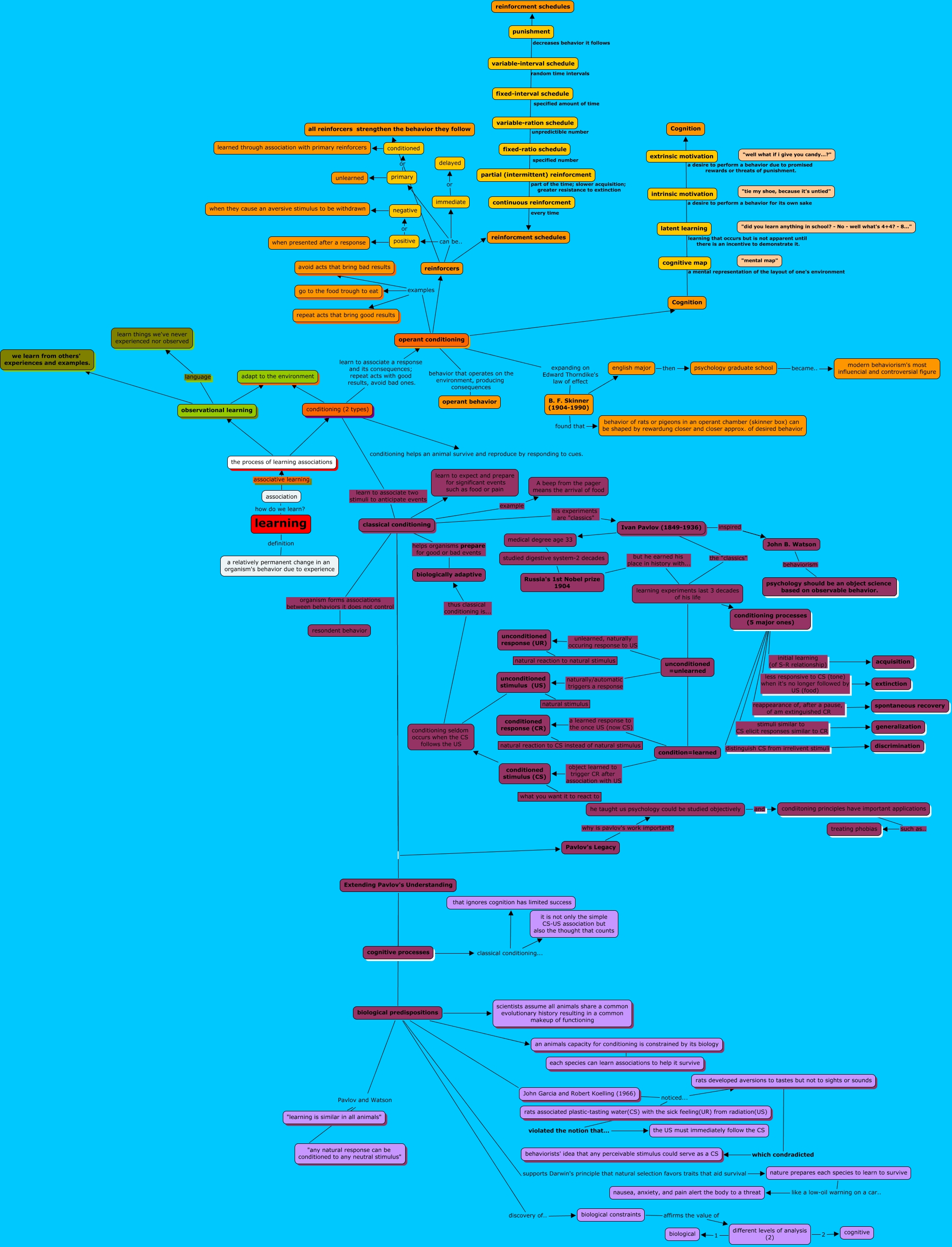 This Concept Map, created with IHMC CmapTools, has information related to: Kalah Poe, learning how do we learn? association, conditioned response (CR) natural reaction to CS instead of natural stimulus, conditioning processes (5 major ones) stimuli similar to CS elicit responses similar to CR generalization, biological predispositions supports Darwin's principle that natural selection favors traits that aid survival nature prepares each species to learn to survive, Russia's 1st Nobel prize 1904 but he earned his place in history with... learning experiments last 3 decades of his life, B. F. Skinner (1904-1990) found that behavior of rats or pigeons in an operant chamber (skinner box) can be shaped by rewardung closer and closer approx. of desired behavior, Ivan Pavlov (1849-1936) medical degree age 33, reinforcers can be.. positive, psychology graduate school became.. modern behaviorism's most influencial and controversial figure, reinforcers can be.. immediate, John B. Watson behaviorism psychology should be an object science based on observable behavior., positive or negative, the process of learning associations observational learning, conditioning (2 types) learn to associate two stimuli to anticipate events classical conditioning, classical conditioning... it is not only the simple CS-US association but also the thought that counts, classical conditioning learn to expect and prepare for significant events such as food or pain, conditioning processes (5 major ones) initial learning (of S-R relationship) acquisition, unconditioned stimulus (US) natural stimulus, Pavlov's Legacy why is pavlov's work important? he taught us psychology could be studied objectively, unconditioned stimulus (US) conditioning seldom occurs when the CS follows the US