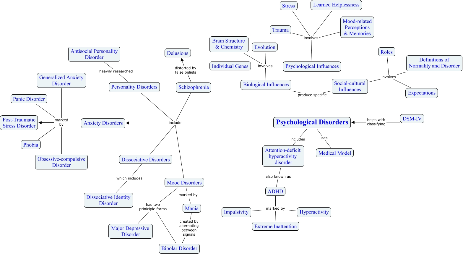This Concept Map, created with IHMC CmapTools, has information related to: Mary Petty 20083, Personality Disorders include Anxiety Disorders, Bipolar Disorder has two priniciple forms Major Depressive Disorder, Mania created by alternating between signals Bipolar Disorder, Brain Structure & Chemistry involves Biological Influences, Biological Influences produce specific Psychological Disorders, Generalized Anxiety Disorder marked by Post-Traumatic Stress Disorder, Impulsivity marked by Extreme Inattention, Stress involves Psychological Influences, Mood Disorders marked by Mania, Psychological Disorders include Anxiety Disorders, Antisocial Personality Disorder heavily researched Personality Disorders, Mood Disorders include Anxiety Disorders, ADHD marked by Extreme Inattention, Individual Genes involves Biological Influences, Schizophrenia include Anxiety Disorders, DSM-IV helps with classifying Psychological Disorders, Schizophrenia distorted by false beliefs Delusions, Panic Disorder marked by Post-Traumatic Stress Disorder, Phobia marked by Post-Traumatic Stress Disorder, Mood Disorders has two priniciple forms Major Depressive Disorder
