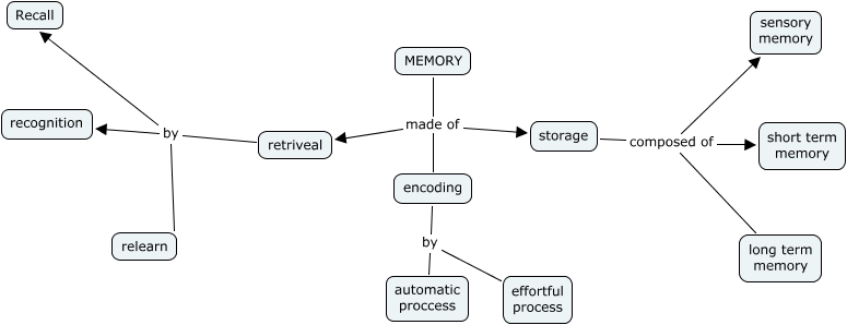 This Concept Map, created with IHMC CmapTools, has information related to: Harry Barraclough memory, retriveal by relearn, encoding by effortful process, MEMORY made of encoding, retriveal by Recall, MEMORY made of retriveal, retriveal by recognition, storage composed of sensory memory, MEMORY made of storage, storage composed of short term memory, encoding by automatic proccess, storage composed of long term memory