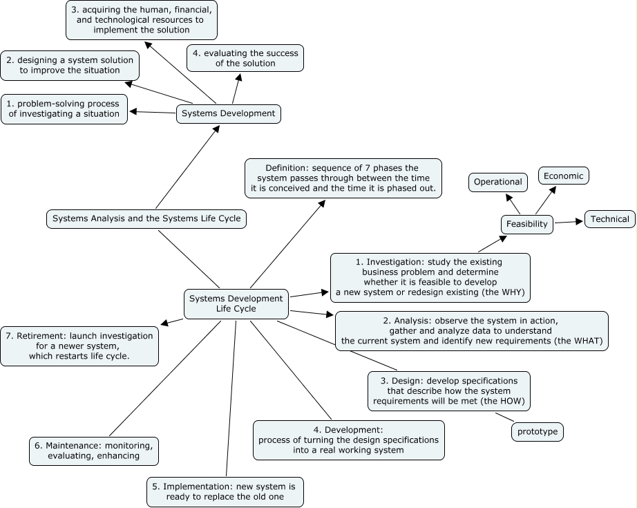 This Concept Map, created with IHMC CmapTools, has information related to: REBECCA, Systems Development Life Cycle 2. Analysis: observe the system in action, gather and analyze data to understand the current system and identify new requirements (the WHAT), Feasibility Technical, Systems Analysis and the Systems Life Cycle Systems Development, Systems Development 1. problem-solving process of investigating a situation, 1. Investigation: study the existing business problem and determine whether it is feasible to develop a new system or redesign existing (the WHY) Feasibility, Systems Development Life Cycle 3. Design: develop specifications that describe how the system requirements will be met (the HOW), Systems Development Life Cycle 4. Development: process of turning the design specifications into a real working system, Systems Development 3. acquiring the human, financial, and technological resources to implement the solution, Systems Development Life Cycle 5. Implementation: new system is ready to replace the old one, Systems Development Life Cycle 7. Retirement: launch investigation for a newer system, which restarts life cycle., Systems Development Life Cycle Definition: sequence of 7 phases the system passes through between the time it is conceived and the time it is phased out., Systems Analysis and the Systems Life Cycle Systems Development Life Cycle, Systems Development Life Cycle 1. Investigation: study the existing business problem and determine whether it is feasible to develop a new system or redesign existing (the WHY), Feasibility Operational, Systems Development 2. designing a system solution to improve the situation, Systems Development 4. evaluating the success of the solution, Feasibility Economic, 3. Design: develop specifications that describe how the system requirements will be met (the HOW) prototype, Systems Development Life Cycle 6. Maintenance: monitoring, evaluating, enhancing