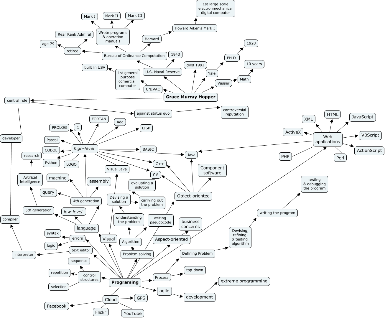 This Concept Map, created with IHMC CmapTools, has information related to: JENNA, Process Defining Problem, Devising a solution carrying out the problem, high-level Visual Java, Cloud Flickr, Algorithm writing pseudocode, Wrote programs & operation manuals Mark III, 5th generation Artifical intelligence, high-level LOGO, Harvard Howard Aiken's Mark I, central role against status quo, Yale PH.D., high-level PROLOG, Bureau of Ordinance Computation Wrote programs & operation manuals, Cloud Facebook, Grace Murray Hopper U.S. Naval Reserve, high-level LISP, writing the program testing & debugging the program, Programing text editor, Defining Problem Devising, refining, & testing algorithm, Bureau of Ordinance Computation retired