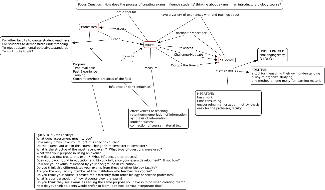 This Concept Map, created with IHMC CmapTools, has information related to: bEAT it! research project, Exams Occupy the time of Students, Students do/don't prepare for Exams, Professors Grade For other faculty to gauge student readiness For students to demonstrate understanding To meet departmental objectives/standards To contribute to GPA, Professors Use Purpose Time available Past Experience Training Conventions/best practices of the field, Students have a variety of exeriences with and feelings about Exams, Exams Assess Students, Exams assess Professors, Exams measure effectiveness of teaching retention/memoriation of information synthesis of information student success connection of course material to.., Professors ???? QUESTIONS for Faculty: What does assessment mean to you? How many times have you taught this specific course? Do the exams you use in this course change from semester to semester? What is the structue of the most recent exam? What type of questions were used? What was your purpose in using an exam? How did you first create this exam? What influenced that process? Does you background in education and biology influence your exam development? If so, how? How are your exams influenced by your background in education? Do you think this differentiates your exams from those of other biology faculty? Are you the only faculty member at this institution who teaches this course? Do you think your course is structured differently from other biology or science professors? What is your perception of how students view the exam? Do you think they see exams as serving the same purpose you have in mind when creating them? How do you think students would prefer to learn, adn how do you incorporate that?, Purpose Time available Past Experience Training Conventions/best practices of the field To write Exams, Exams Challenge/Motivate Students, Exams are a tool for Professors, Students view exams as POSITIVE: a tool for measuring their own understanding a way to organize studying one method among many for learning material, Students view exams as UNDETERMINED: challenging/easy fair/unfair, Professors Grade Exams, Students view exams as NEGATIVE: busy work time consuming encouraging memorization, not synthesis easy for the professor/faculty, Purpose Time available Past Experience Training Conventions/best practices of the field influence or don't influence? effectiveness of teaching retention/memoriation of information synthesis of information student success connection of course material to..