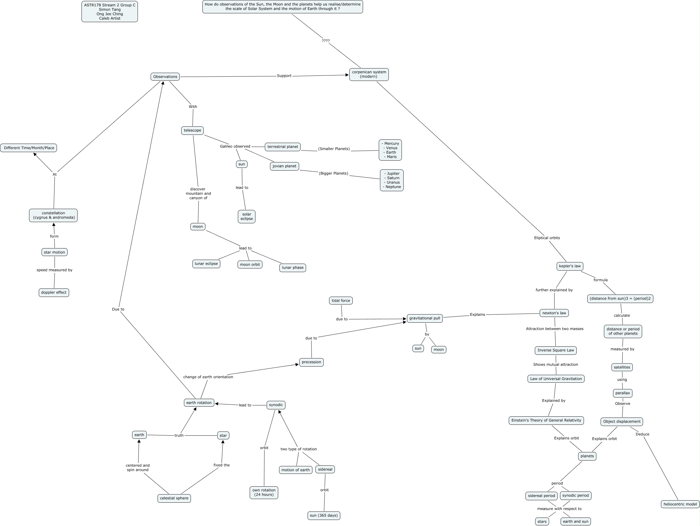 This Concept Map, created with IHMC CmapTools, has information related to: Revised 19sept, earth truth earth rotation, moon lead to lunar eclipse, How do observations of the Sun, the Moon and the planets help us realise/determine the scale of Solar System and the motion of Earth through it ? ???? corpenican system (modern), Observations With telescope, terrestrial planet Galileo observed sun, gravitational pull by moon, kepler's law further explained by newton's law, telescope discover mountain and canyon of moon, distance or period of other planets measured by satellites, kepler's law formula (distance from sun)3 = (period)2, corpenican system (modern) Eliptical orbits kepler's law, jovian planet Galileo observed sun, moon lead to lunar phase, Object displacement Explains orbit planets, sidereal period measure with respect to stars, star truth earth rotation, telescope Galileo observed sun, precession due to gravitational pull, gravitational pull by sun, Inverse Square Law Shows mutual attraction Law of Universal Gravitation