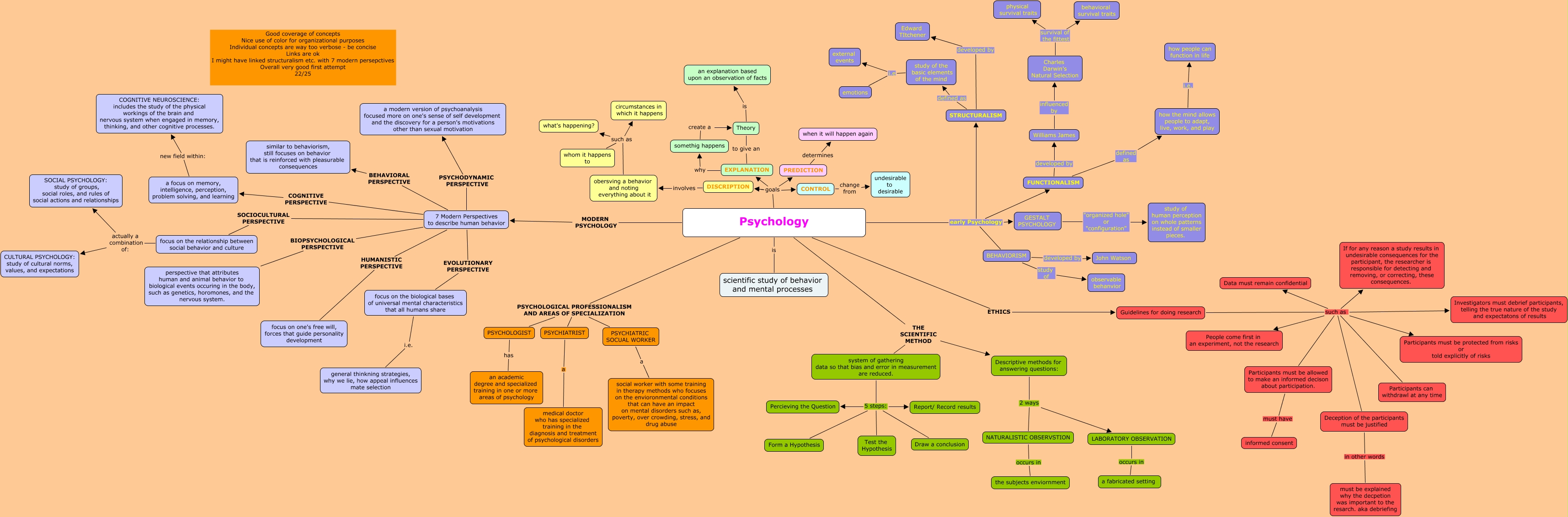 This Concept Map, created with IHMC CmapTools, has information related to: Beau Buck CH1 22, Guidelines for doing research such as Participants must be allowed to make an informed decison about participation., Psychology goals EXPLANATION, Theory is an explanation based upon an observation of facts, system of gathering data so that bias and error in measurement are reduced. 5 steps: Test the Hypothesis, system of gathering data so that bias and error in measurement are reduced. 5 steps: Form a Hypothesis, system of gathering data so that bias and error in measurement are reduced. 5 steps: Percieving the Question, Williams James influenced by Charles Darwin's Natural Selection, GESTALT PSYCHOLOGY "organized hole" or "configuration" study of human perception on whole patterns instead of smaller pieces., focus on the biological bases of universal mental characteristics that all humans share i.e. general thinkning strategies, why we lie, how appeal influences mate selection, Psychology goals CONTROL, Psychology goals PREDICTION, Psychology ETHICS Guidelines for doing research, 7 Modern Perspectives to describe human behavior HUMANISTIC PERSPECTIVE focus on one's free will, forces that guide personality development, focus on the relationship between social behavior and culture actually a combination of: CULTURAL PSYCHOLOGY: study of cultural norms, values, and expectations, PREDICTION determines when it will happen again, Guidelines for doing research such as Data must remain confidential, EXPLANATION why somethig happens, Guidelines for doing research such as People come first in an experiment, not the research, Psychology early Psychology STRUCTURALISM, 7 Modern Perspectives to describe human behavior PSYCHODYNAMIC PERSPECTIVE a modern version of psychoanalysis focused more on one's sense of self development and the discovery for a person's motivations other than sexual motivation