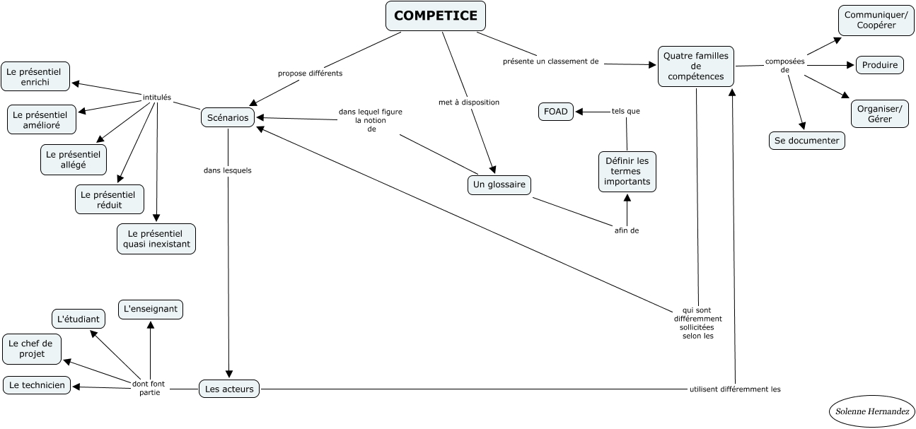 Cette carte de concepts créée avec IHMC CmapTools traite de: Carte_conceptuelle_Competice_Solenne_Hernandez, Un glossaire afin de Définir les termes importants, Quatre familles de compétences composées de Se documenter, Les acteurs dont font partie L'enseignant, Quatre familles de compétences composées de Produire, Un glossaire dans lequel figure la notion de Scénarios, Scénarios dans lesquels Les acteurs, COMPETICE propose différents Scénarios, Scénarios intitulés Le présentiel réduit, Définir les termes importants tels que FOAD, Quatre familles de compétences qui sont différemment sollicitées selon les Scénarios, COMPETICE présente un classement de Quatre familles de compétences, Les acteurs dont font partie Le chef de projet, Quatre familles de compétences composées de Organiser/ Gérer, Quatre familles de compétences composées de Communiquer/ Coopérer, Les acteurs dont font partie Le technicien, COMPETICE met à disposition Un glossaire, Scénarios intitulés Le présentiel amélioré, Les acteurs dont font partie L'étudiant, Scénarios intitulés Le présentiel allégé, Scénarios intitulés Le présentiel enrichi