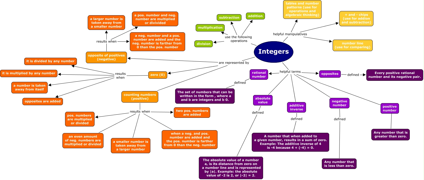 This Concept Map, created with IHMC CmapTools, has information related to: MATH_integers, Integers are represented by opposite of positives (negative), zero (0) results when it is multiplied by any number, rational number defined The set of numbers that can be written in the form , where a and b are integers and b 0., Integers helpful terms opposites, Integers are represented by counting numbers (positive), Integers helpful terms absolute value, Integers are represented by zero (0), Integers helpful terms additive inverse, zero (0) results when opposites are added, Integers use the following operations multiplication, counting numbers (positive) results when an even amount of neg. numbers are multiplied or divided, counting numbers (positive) results when two pos. numbers are added, Integers helpful terms positive number, Integers use the following operations subtraction, negative number defined Any number that is less than zero., positive number defined Any number that is greater than zero., Integers helpful terms rational number, Integers use the following operations addition, opposites defined Every positive rational number and its negative pair., zero (0) results when it is divided by any number
