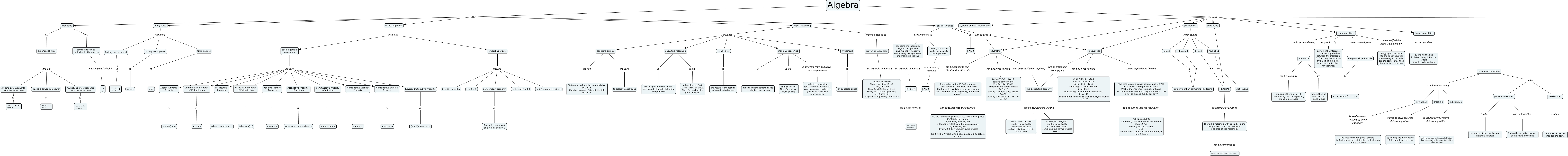 This Concept Map, created with IHMC CmapTools, has information related to: MATH_algebra, intercepts are where the line touches the x and y axis, basic algebraic properties includes Reverse Distributive Property, linear equations can be verified if a point is on a line by Plugging in the point into the linear equation then seeing if both side are the same. If so then the point is on the line., dividing two exponents with the same base is m n m-n xix=x, taking the opposite is a+-a=0, parallel lines is when the slopes of the two lines are the same, Associative Property of Addition is (a + b) + c = a + (b + c), zero product property is if ab = 0, then a = 0 or b = 0 or both = 0, exponents use exponential rules, absolute values can be used in equations, Associative Property of Multiplication is (ab)c = a(bc), Distributive Property is a(b + c) = ab + ac, exponential rules are like taking a power to a power, proven at every step an example of which is <math xmlns="http://www.w3.org/1998/Math/MathML"> <mtext> Given x+5x+6=0