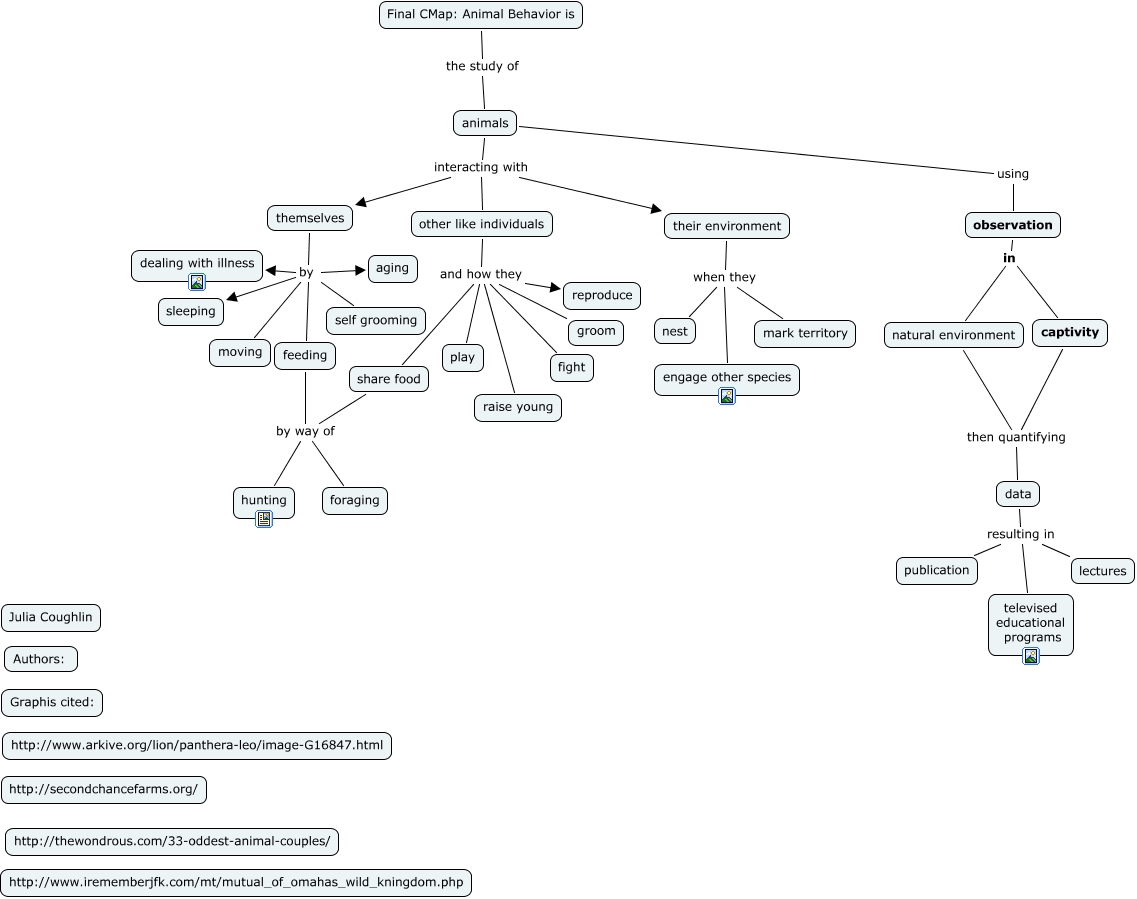 This Concept Map, created with IHMC CmapTools, has information related to: Coughlin What is Animal Behavior - Final, themselves by sleeping, Final CMap: Animal Behavior is the study of animals, other like individuals and how they reproduce, feeding by way of foraging, other like individuals and how they groom, data resulting in lectures, animals using observation, other like individuals and how they fight, other like individuals and how they raise young, animals interacting with their environment, animals interacting with themselves, observation in captivity, animals interacting with other like individuals, themselves by moving, captivity then quantifying data, share food by way of foraging, themselves by dealing with illness, other like individuals and how they play, natural environment then quantifying data, themselves by feeding