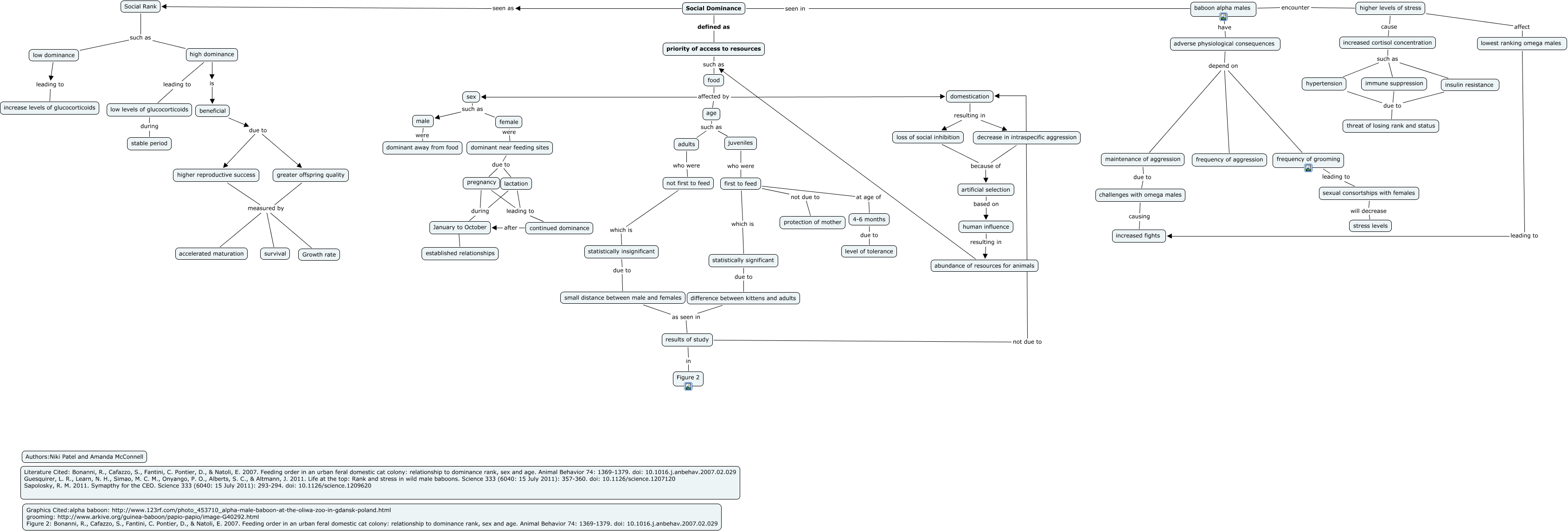 This Concept Map, created with IHMC CmapTools, has information related to: McConnell Patel Soc Dom, first to feed which is statistically significant, greater offspring quality measured by Growth rate, high dominance leading to low levels of glucocorticoids, food affected by domestication, baboon alpha males encounter higher levels of stress, sexual consortships with females will decrease stress levels, greater offspring quality measured by survival, Social Dominance seen as Social Rank, results of study not due to domestication, statistically insignificant due to small distance between male and females, increased cortisol concentration such as hypertension, lactation during January to October, continued dominance after January to October, pregnancy leading to continued dominance, adults who were not first to feed, insulin resistance due to threat of losing rank and status, low levels of glucocorticoids during stable period, immune suppression due to threat of losing rank and status, adverse physiological consequences depend on frequency of grooming, adverse physiological consequences depend on maintenance of aggression