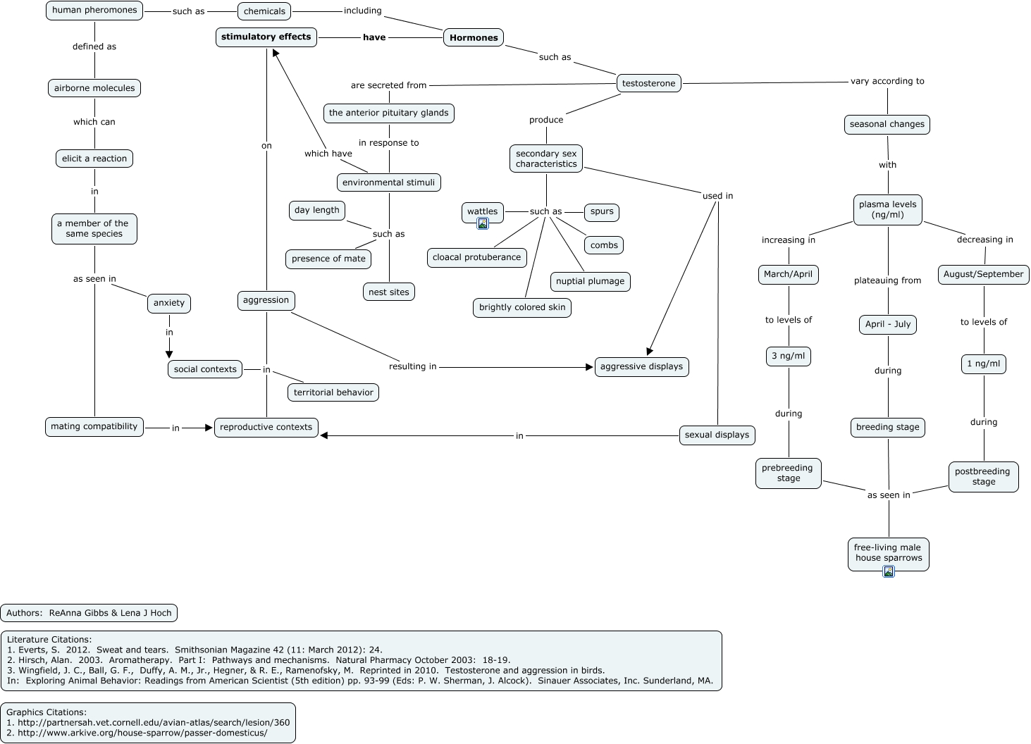 This Concept Map, created with IHMC CmapTools, has information related to: Gibbs alone Hormones, anxiety in social contexts, breeding stage as seen in free-living male house sparrows, Hormones such as testosterone, a member of the same species as seen in anxiety, airborne molecules which can elicit a reaction, Hormones have stimulatory effects, environmental stimuli such as day length, elicit a reaction in a member of the same species, a member of the same species as seen in mating compatibility, environmental stimuli which have stimulatory effects, secondary sex characteristics used in aggressive displays, August/September to levels of 1 ng/ml, stimulatory effects on aggression, April - July during breeding stage, the anterior pituitary glands in response to environmental stimuli, sexual displays in reproductive contexts, testosterone vary according to seasonal changes, 1 ng/ml during postbreeding stage, environmental stimuli such as presence of mate, environmental stimuli such as nest sites