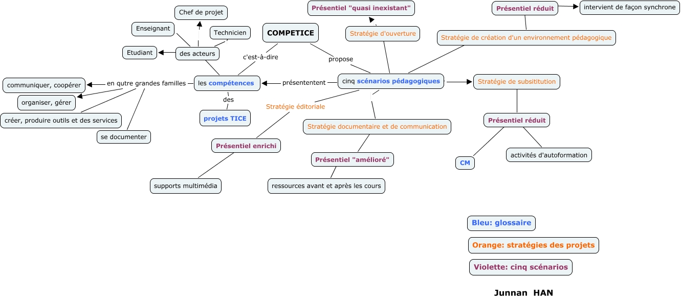 此概念图以 IHMC CmapTools 创建, 内含信息有关于: Competice_Junnan_HAN, cinq scénarios pédagogiques ???? Stratégie de création d'un environnement pédagogique, des acteurs Enseignant, Présentiel "amélioré" ???? ressources avant et après les cours, les compétences en qutre grandes familles se documenter, Stratégie documentaire et de communication ???? Présentiel "amélioré", Présentiel réduit ???? activités d'autoformation, les compétences en qutre grandes familles créer, produire outils et des services, COMPETICE c'est-à-dire les compétences, Stratégie de création d'un environnement pédagogique ???? Présentiel réduit, cinq scénarios pédagogiques Stratégie documentaire et de communication, des acteurs Etudiant, les compétences en qutre grandes familles organiser, gérer, cinq scénarios pédagogiques Stratégie éditoriale Présentiel enrichi, des acteurs Chef de projet, les compétences des projets TICE, cinq scénarios pédagogiques ???? Stratégie d'ouverture, COMPETICE propose cinq scénarios pédagogiques, Présentiel enrichi ???? supports multimédia, cinq scénarios pédagogiques présententent les compétences, des acteurs Technicien