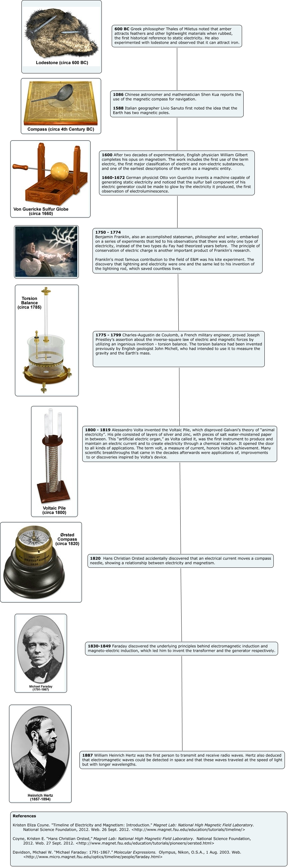 This Concept Map, created with IHMC CmapTools, has information related to: RachelPeiqianGregE&M, 1775 - 1799 Charles-Augustin de Coulomb, a French military engineer, proved Joseph Priestley’s assertion about the inverse-square law of electric and magnetic forces by utilizing an ingenious invention - torsion balance. The torsion balance had been invented previously by English geologist John Michell, who had intended to use it to measure the gravity and the Earth's mass. 1800 - 1819 Alessandro Volta invented the Voltaic Pile, which disproved Galvani’s theory of “animal electricity”. His pile consisted of layers of silver and zinc, with pieces of salt water-moistened paper in between. This “artificial electric organ,” as Volta called it, was the first instrument to produce and maintain an electric current and to create electricity through a chemical reaction. It opened the door to all kinds of applications. The term volt, a measure of current, honors Volta’s achievement. Many scientific breakthroughs that came in the decades afterwards were applications of, improvements to or discoveries inspired by Volta’s device., 1750 - 1774 Benjamin Franklin, also an accomplished statesman, philosopher and writer, embarked on a series of experiments that led to his observations that there was only one type of electricity, instead of the two types du Fay had theorized years before. The principle of conservation of electric charge is another important product of Franklin's research. Franklin's most famous contribution to the field of E&M was his kite experiment. The discovery that lightning and electricity were one and the same led to his invention of the lightning rod, which saved countless lives. 1775 - 1799 Charles-Augustin de Coulomb, a French military engineer, proved Joseph Priestley’s assertion about the inverse-square law of electric and magnetic forces by utilizing an ingenious invention - torsion balance. The torsion balance had been invented previously by English geologist John Michell, who had intended to use it to measure the gravity and the Earth's mass., 1600 After two decades of experimentation, English physician William Gilbert completes his opus on magnetism. The work includes the first use of the term electric, the first major classification of electric and non-electric substances, and one of the earliest descriptions of the earth as a magnetic entity. 1660-1672 German physicist Otto von Guericke invents a machine capable of generating static electricity and noticed that the sulfur ball component of his electric generator could be made to glow by the electricity it produced, the first observation of electroluminescence. 1750 - 1774 Benjamin Franklin, also an accomplished statesman, philosopher and writer, embarked on a series of experiments that led to his observations that there was only one type of electricity, instead of the two types du Fay had theorized years before. The principle of conservation of electric charge is another important product of Franklin's research. Franklin's most famous contribution to the field of E&M was his kite experiment. The discovery that lightning and electricity were one and the same led to his invention of the lightning rod, which saved countless lives., 1830-1849 Faraday discovered the underlying principles behind electromagnetic induction and magneto-electric induction, which led him to invent the transformer and the generator respectively. 1887 William Heinrich Hertz was the first person to transmit and receive radio waves. Hertz also deduced that electromagnetic waves could be detected in space and that these waves traveled at the speed of light but with longer wavelengths., 1820 Hans Christian Orsted accidentally discovered that an electrical current moves a compass needle, showing a relationship between electricity and magnetism. 1830-1849 Faraday discovered the underlying principles behind electromagnetic induction and magneto-electric induction, which led him to invent the transformer and the generator respectively., 1800 - 1819 Alessandro Volta invented the Voltaic Pile, which disproved Galvani’s theory of “animal electricity”. His pile consisted of layers of silver and zinc, with pieces of salt water-moistened paper in between. This “artificial electric organ,” as Volta called it, was the first instrument to produce and maintain an electric current and to create electricity through a chemical reaction. It opened the door to all kinds of applications. The term volt, a measure of current, honors Volta’s achievement. Many scientific breakthroughs that came in the decades afterwards were applications of, improvements to or discoveries inspired by Volta’s device. 1820 Hans Christian Orsted accidentally discovered that an electrical current moves a compass needle, showing a relationship between electricity and magnetism., 1086 Chinese astronomer and mathematician Shen Kua reports the use of the magnetic compass for navigation. 1588 Italian geographer Livio Sanuto first noted the idea that the Earth has two magnetic poles. 1600 After two decades of experimentation, English physician William Gilbert completes his opus on magnetism. The work includes the first use of the term electric, the first major classification of electric and non-electric substances, and one of the earliest descriptions of the earth as a magnetic entity. 1660-1672 German physicist Otto von Guericke invents a machine capable of generating static electricity and noticed that the sulfur ball component of his electric generator could be made to glow by the electricity it produced, the first observation of electroluminescence., 600 BC Greek philosopher Thales of Miletus noted that amber attracts feathers and other lightweight materials when rubbed, the first historical reference to static electricity. He also experimented with lodestone and observed that it can attract iron. 1086 Chinese astronomer and mathematician Shen Kua reports the use of the magn
