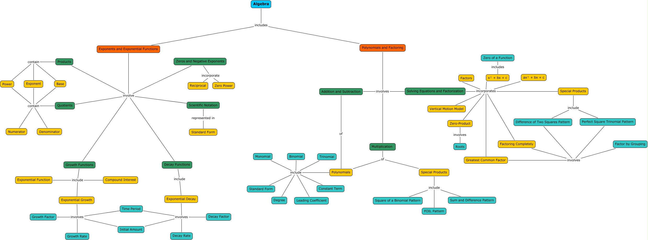 This Concept Map, created with IHMC CmapTools, has information related to: MATH_algebra3, Exponential Growth involves Growth Rate, Polynomials include Degree, Solving Equations and Factorization incorporates Zero-Product, Quotients contain Power, Scientific Notation represented in Standard Form, Solving Equations and Factorization incorporates Factors, Polynomials and Factoring involves Addition and Subtraction, Exponential Decay involves Decay Factor, Solving Equations and Factorization incorporates Special Products, Polynomials include Binomial, Factoring Completely involves Perfect Square Trinomial Pattern, Addition and Subtraction of Polynomials, Special Products include Sum and Difference Pattern, Growth Functions include Exponential Growth, Quotients contain Numerator, Exponential Decay involves Initial Amount, Exponents and Exponential Functions involve Zeros and Negative Exponents, Polynomials and Factoring involves Multiplication, Exponents and Exponential Functions involve Decay Functions, Special Products include Difference of Two Squares Pattern