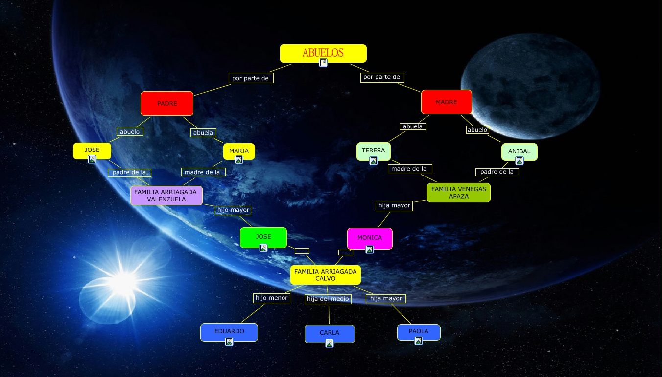 Este Cmap, tiene información relacionada con: Arbol Genealogico, ABUELOS por parte de PADRE, PADRE abuela MARIA, PADRE abuelo JOSE, TERESA madre de la FAMILIA VENEGAS APAZA, FAMILIA ARRIAGADA CALVO hijo menor EDUARDO, FAMILIA VENEGAS APAZA hija mayor MONICA, FAMILIA ARRIAGADA CALVO hija mayor PAOLA, FAMILIA ARRIAGADA CALVO hija del medio CARLA, MADRE abuela TERESA, MONICA ???? FAMILIA ARRIAGADA CALVO, FAMILIA ARRIAGADA VALENZUELA madre de la MARIA, MADRE por parte de ABUELOS, JOSE padre de la FAMILIA ARRIAGADA VALENZUELA, MADRE abuelo ANIBAL, JOSE ???? FAMILIA ARRIAGADA CALVO, FAMILIA ARRIAGADA VALENZUELA hijo mayor JOSE, ANIBAL padre de la FAMILIA VENEGAS APAZA