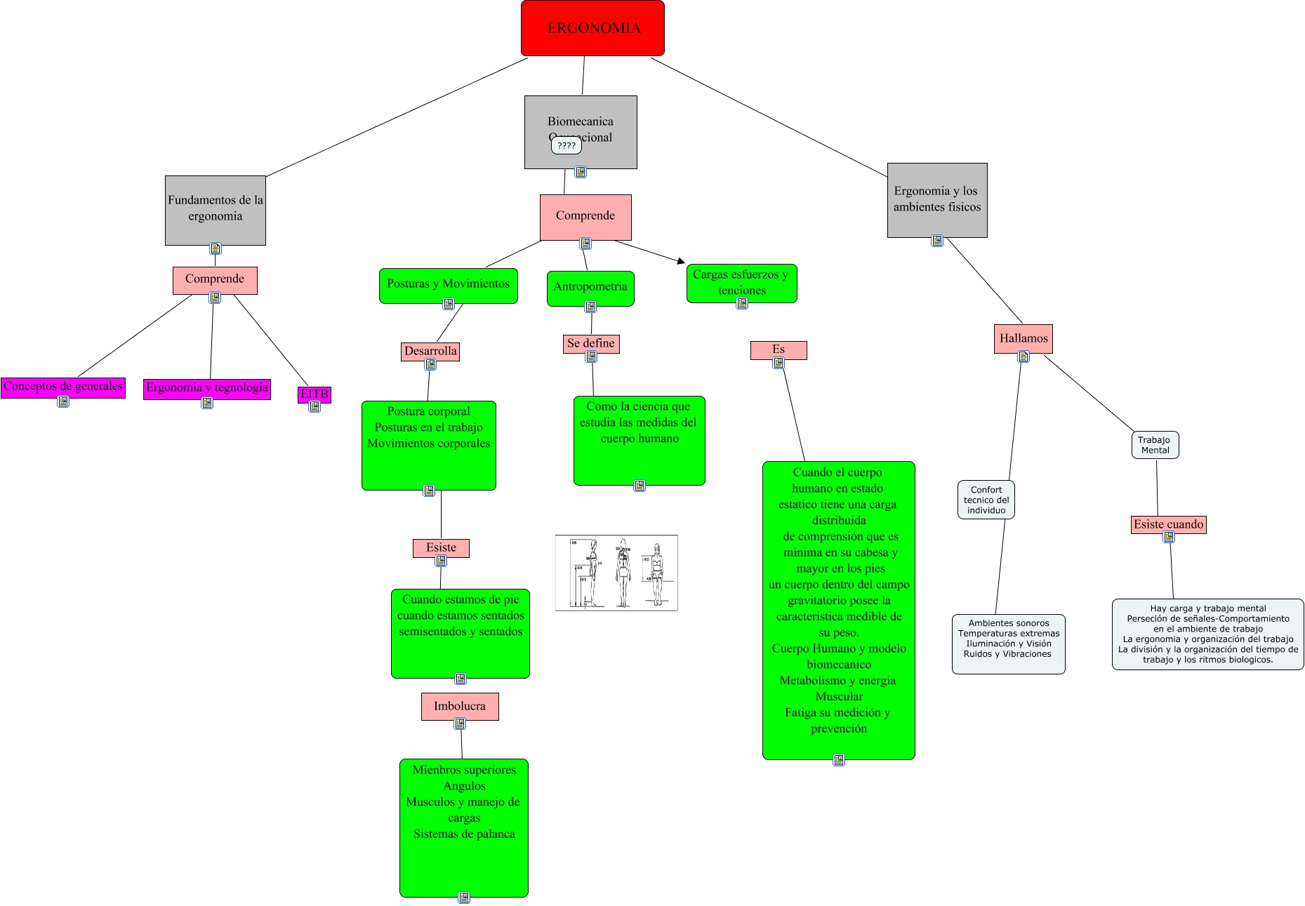 Este Cmap, tiene información relacionada con: image, Hallamos ???? Ambientes sonoros Temperaturas extremas Iluminación y Visión Ruidos y Vibraciones, Fundamentos de la ergonomia ???? Comprende, Comprende ???? Posturas y Movimientos, Antropometria ???? Se define, Desarrolla ???? Postura corporal Posturas en el trabajo Movimientos corporales, Comprende ???? Conceptos de generales, ERGONOMIA ???? Fundamentos de la ergonomia, Comprende ???? EITB, Imbolucra ???? Mienbros superiores Angulos Musculos y manejo de cargas Sistemas de palanca, Comprende ???? ????, ERGONOMIA ???? Biomecanica Ocupacional, Es ???? Cuando el cuerpo humano en estado estatico tiene una carga distribuida de comprensión que es minima en su cabesa y mayor en los pies un cuerpo dentro del campo gravitatorio posee la caracteristica medible de su peso. Cuerpo Humano y modelo biomecanico Metabolismo y energia Muscular Fatiga su medición y prevención, Esiste cuando ???? Hay carga y trabajo mental Perseción de señales-Comportamiento en el ambiente de trabajo La ergonomia y organización del trabajo La división y la organización del tiempo de trabajo y los ritmos biologicos., Se define ???? Como la ciencia que estudia las medidas del cuerpo humano, Ergonomia y los ambientes fisicos ???? Hallamos, ERGONOMIA ???? Ergonomia y los ambientes fisicos, Comprende ???? Antropometria, Biomecanica Ocupacional ???? ????, Comprende ???? Cargas esfuerzos y tenciones, Hallamos ???? Trabajo Mental