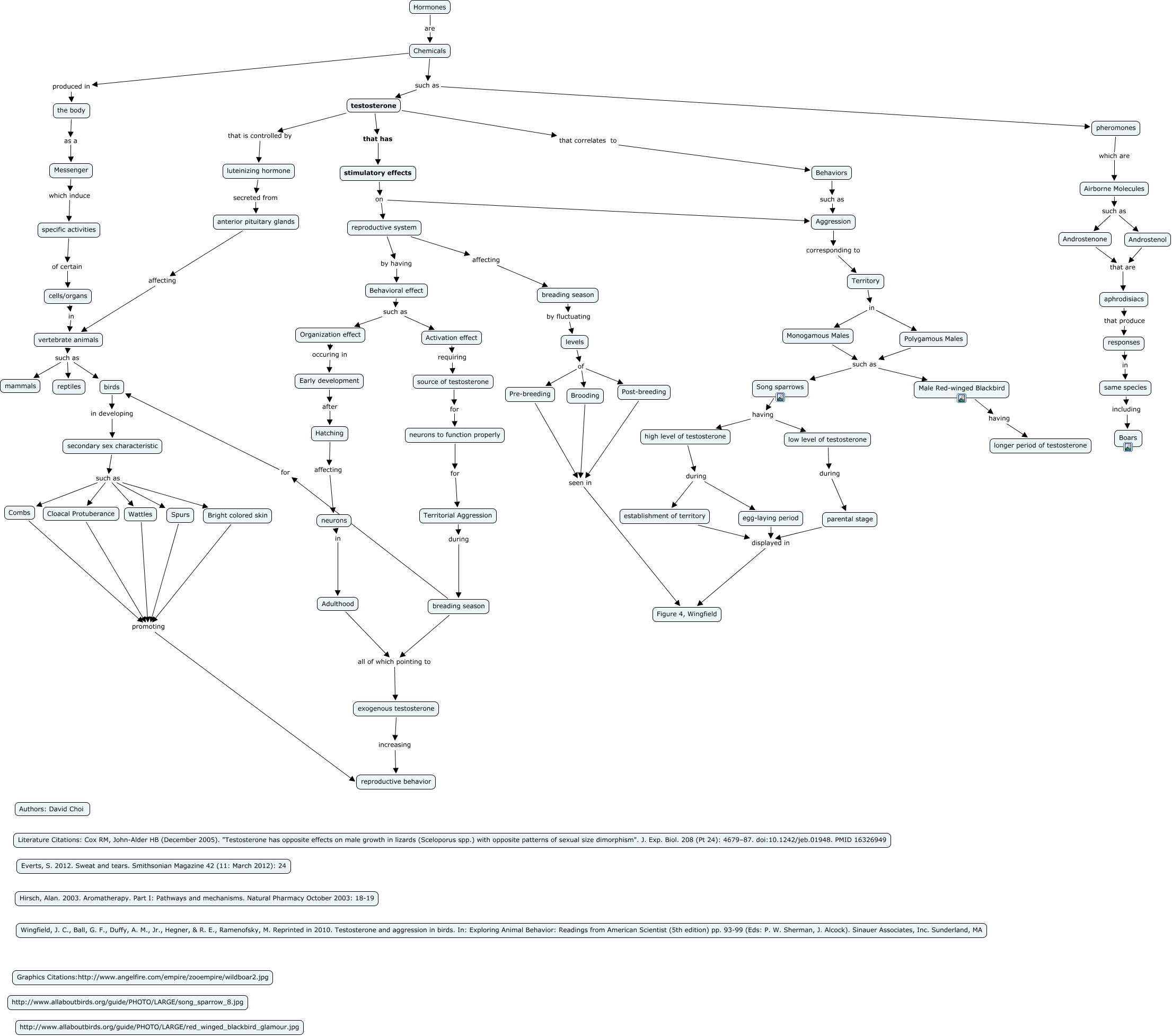 This Concept Map, created with IHMC CmapTools, has information related to: Choi alone Hormones 1, birds in developing secondary sex characteristic, Combs promoting reproductive behavior, breading season all of which pointing to exogenous testosterone, aphrodisiacs that produce responses, Song sparrows having high level of testosterone, high level of testosterone during establishment of territory, neurons to function properly for Territorial Aggression, Post-breeding seen in Figure 4, Wingfield, Spurs promoting reproductive behavior, anterior pituitary glands affecting vertebrate animals, Activation effect requiring source of testosterone, vertebrate animals such as mammals, neurons in Adulthood, the body as a Messenger, specific activities of certain cells/organs, pheromones which are Airborne Molecules, luteinizing hormone secreted from anterior pituitary glands, Monogamous Males such as Male Red-winged Blackbird, secondary sex characteristic such as Spurs, exogenous testosterone increasing reproductive behavior