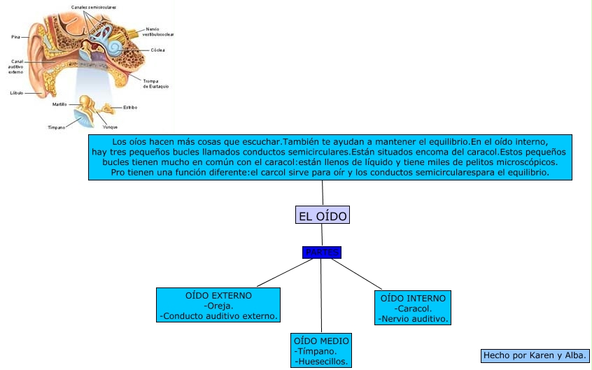 Este Cmap, tiene información relacionada con: EL OIDO, PARTES ???? OÍDO EXTERNO -Oreja. -Conducto auditivo externo., PARTES ???? OÍDO INTERNO -Caracol. -Nervio auditivo., PARTES ???? OÍDO MEDIO -Tímpano. -Huesecillos., EL OÍDO ???? PARTES, EL OÍDO ???? Los oíos hacen más cosas que escuchar.También te ayudan a mantener el equilibrio.En el oído interno, hay tres pequeños bucles llamados conductos semicirculares.Están situados encoma del caracol.Estos pequeños bucles tienen mucho en común con el caracol:están llenos de líquido y tiene miles de pelitos microscópicos. Pro tienen una función diferente:el carcol sirve para oír y los conductos semicircularespara el equilibrio.