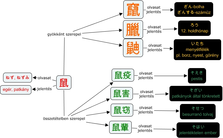 This Concept Map, created with IHMC CmapTools, has information related to: 鼠_MSZ_20121004, 鼠 összetételben szerepel 鼠輩, 鼠害 olvasat jelentés そがい patkányok által tönkretett, 竄 olvasat jelentés ざん-bolha ざんする-számüz, 鼠 összetételben szerepel 鼠疫, 臘 olvasat jelentés ろう 12. holdhónap, 鼠 gyökként szerepel 鼬, 鼠 gyökként szerepel 臘, 鼠 olvasat ねず, ねずみ, 鼠窃 olvasat jelentés そせつ besurranó tolvaj, 鼠 összetételben szerepel 鼠窃, 鼠 jelentés egér, patkány, 鼠疫 olvasat jelentés そえき pestis, 鼠 gyökként szerepel 竄, 鼠 összetételben szerepel 鼠害, 鼠輩 olvasat jelentés そはい jelentéktelen ember, 鼬 olvasat jelentés いたち menyétfélék pl. borz, nyest, görény