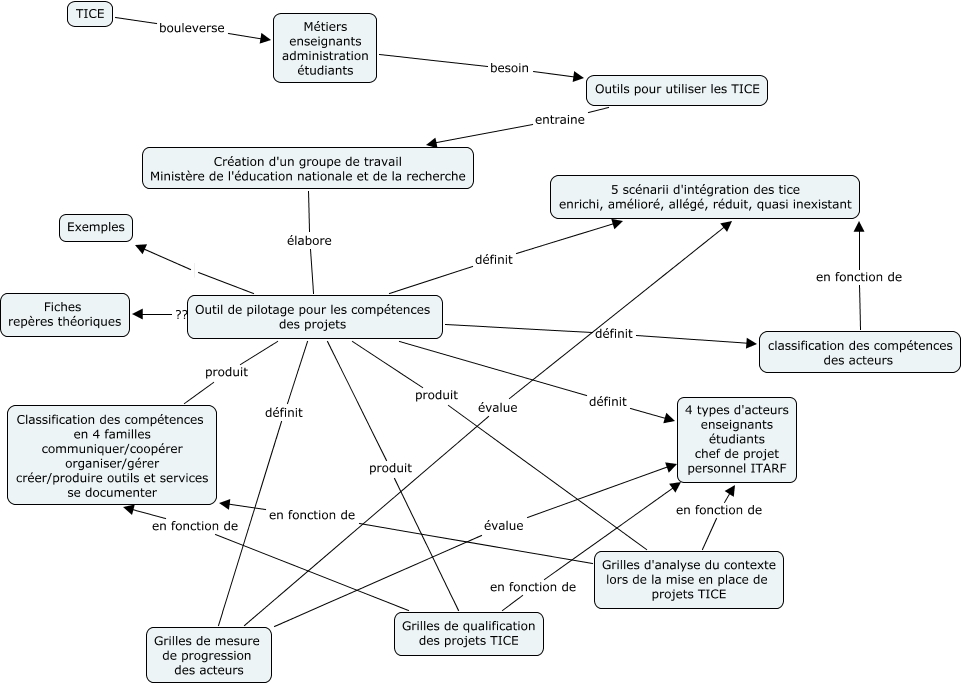 Cette carte de concepts créée avec IHMC CmapTools traite de: TICE, Outil de pilotage pour les compétences des projets produit Grilles d'analyse du contexte lors de la mise en place de projets TICE, Outil de pilotage pour les compétences des projets définit classification des compétences des acteurs, TICE bouleverse Métiers enseignants administration étudiants, Outil de pilotage pour les compétences des projets définit Grilles de mesure de progression des acteurs, Outils pour utiliser les TICE entraine Création d'un groupe de travail Ministère de l'éducation nationale et de la recherche, Outil de pilotage pour les compétences des projets définit 4 types d'acteurs enseignants étudiants chef de projet personnel ITARF, Grilles de mesure de progression des acteurs évalue ????, Outil de pilotage pour les compétences des projets ???? Fiches repères théoriques, Grilles d'analyse du contexte lors de la mise en place de projets TICE en fonction de 4 types d'acteurs enseignants étudiants chef de projet personnel ITARF, Grilles de qualification des projets TICE en fonction de Classification des compétences en 4 familles communiquer/coopérer organiser/gérer créer/produire outils et services se documenter, classification des compétences des acteurs en fonction de 5 scénarii d'intégration des tice enrichi, amélioré, allégé, réduit, quasi inexistant, Création d'un groupe de travail Ministère de l'éducation nationale et de la recherche élabore Outil de pilotage pour les compétences des projets, Outil de pilotage pour les compétences des projets définit 5 scénarii d'intégration des tice enrichi, amélioré, allégé, réduit, quasi inexistant, Grilles de mesure de progression des acteurs évalue ????, Métiers enseignants administration étudiants besoin Outils pour utiliser les TICE, Grilles d'analyse du contexte lors de la mise en place de projets TICE en fonction de Classification des compétences en 4 familles communiquer/coopérer organiser/gérer créer/produire outils et services se documenter, Outil de pilotage pour les compétences des projets Exemples, Outil de pilotage pour les compétences des projets produit Grilles de qualification des projets TICE, Grilles de qualification des projets TICE en fonction de ????, Outil de pilotage pour les compétences des projets produit Classification des compétences en 4 familles communiquer/coopérer organiser/gérer créer/produire outils et services se documenter