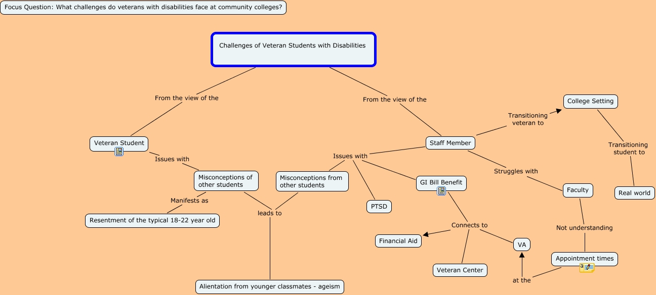 This Concept Map, created with IHMC CmapTools, has information related to: Untitled, Misconceptions from other students leads to Alientation from younger classmates - ageism, Staff Member Transitioning veteran to College Setting, Challenges of Veteran Students with Disabilities From the view of the Staff Member, Faculty Not understanding Appointment times, Staff Member Struggles with Faculty, Misconceptions of other students Manifests as Resentment of the typical 18-22 year old, GI Bill Benefit Connects to VA, Misconceptions of other students leads to Alientation from younger classmates - ageism, Staff Member Issues with Misconceptions from other students, College Setting Transitioning student to Real world, GI Bill Benefit Connects to Financial Aid, Appointment times at the VA, Staff Member Issues with PTSD, GI Bill Benefit Connects to Veteran Center, Veteran Student Issues with Misconceptions of other students, Staff Member Issues with GI Bill Benefit, Challenges of Veteran Students with Disabilities From the view of the Veteran Student