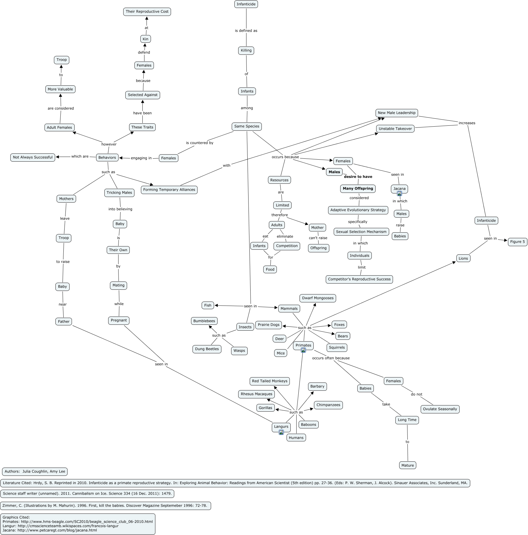 This Concept Map, created with IHMC CmapTools, has information related to: Coughlin Lee Infanticide, Infanticide seen in Lions, Males raise Babies, Same Species occurs because Resources, Primates occurs often because Babies, Mammals such as Foxes, Mothers leave Troop, Insects such as Wasps, Sexual Selection Mechanism in which Individuals, Mammals such as Lions, Primates such as Baboons, Same Species seen in Insects, Mammals such as Deer, Mammals such as Dwarf Mongooses, Females engaging in Behaviors, Females seen in Jacana, Infanticide seen in Figure 5, Mammals such as Bears, Insects such as Bumblebees, Unstable Takeover increases Infanticide, Same Species seen in Mammals