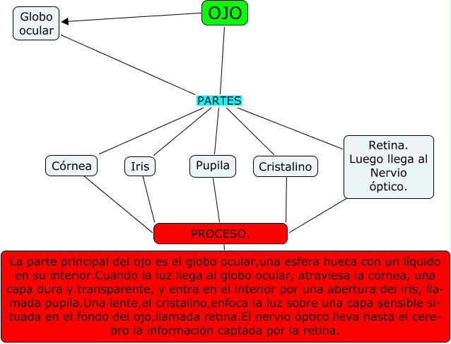 Este Cmap, tiene información relacionada con: Ojo, OJO PARTES Cristalino, Iris ???? PROCESO., OJO PARTES Córnea, Córnea ???? PROCESO., PROCESO. ???? La parte principal del ojo es el globo ocular,una esfera hueca con un líquido en su interior.Cuando la luz llega al globo ocular, atraviesa la córnea, una capa dura y transparente, y entra en el interior por una abertura del iris, lla- mada pupila.Una lente,el cristalino,enfoca la luz sobre una capa sensible si- tuada en el fondo del ojo,llamada retina.El nervio óptico lleva hasta el cere- bro la información captada por la retina., Globo ocular PARTES Retina. Luego llega al Nervio óptico., OJO PARTES Retina. Luego llega al Nervio óptico., Globo ocular PARTES Pupila, Globo ocular PARTES Córnea, Cristalino ???? PROCESO., OJO ???? Globo ocular, OJO PARTES Iris, OJO PARTES Pupila, Pupila ???? PROCESO., Retina. Luego llega al Nervio óptico. ???? PROCESO., Globo ocular PARTES Iris, Globo ocular PARTES Cristalino