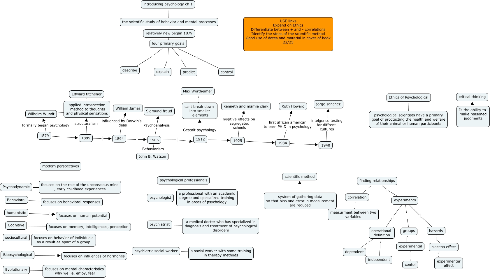 This Concept Map, created with IHMC CmapTools, has information related to: ch 1ben siegel alternate, introducing psychology ch 1 the scientific study of behavior and mental processes, 1879 1885, Max Wertheimer cant break down into smaller elements, four primary goals describe, 1934 1940, applied introspection method to thoughts and physical sensations Edward titchener, humanistic focuses on human potential, operational definition dependent, 1940 intelgence testing for diffrent cultures jorge sanchez, operational definition independent, 1905 Psychoanalysis Sigmund freud, four primary goals explain, finding relationships correlation, Ethics of Psychological psychological scientists have a primary goal of proctecting the health and welfare of their animal or human participants, system of gathering data so that bias and error in measurement are reduced scientific method, Psychodynamic focuses on the role of the unconscious mind , early childhood experiences, Cognitive focuses on memory, intelligences, perception, experiments hazards, 1885 1894, 1934 first african american to earn PH.D in psychology Ruth Howard