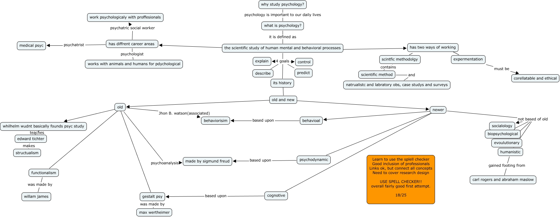This Concept Map, created with IHMC CmapTools, has information related to: JAYSON BLEDSOES CH.1 CMAPS, old psychoanalysis made by sigmund freud, scintfic methodolgy contains scientific method, the scientific study of human mental and behavioral processes ???? has two ways of working, newer not based of old biopsychological, newer not based of old humanistic, the scientific study of human mental and behavioral processes 4 goals control, old and new ???? old, old and new ???? newer, newer ???? psychodynamic, newer ???? behavioal, old Jhon B. watson(associated) behaviorisim, behavioal based upon behaviorisim, has diffrent career areas psychatrist medical psyc, has two ways of working ???? scintfic methodolgy, gestalt psy was made by max wertheimer, newer not based of old evoulutionary, old ???? whilhelm wudnt basically founds psyc study, psychodynamic based upon made by sigmund freud, has diffrent career areas psychologist works with animals and humans for pdychological, has two ways of working ???? expermentation