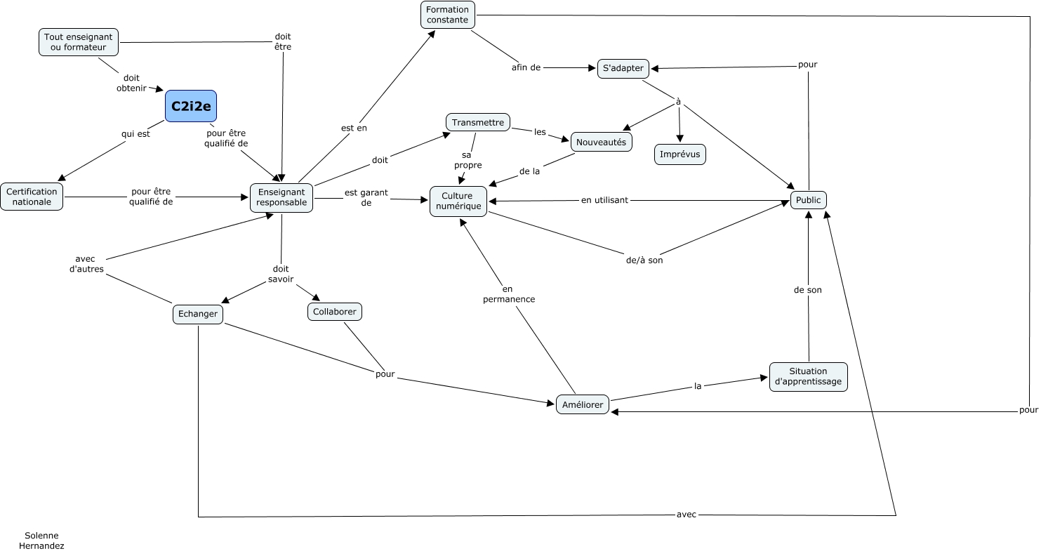 Cette carte de concepts créée avec IHMC CmapTools traite de: C2i2e_Solenne_Hernandez, Tout enseignant ou formateur doit être Enseignant responsable, Certification nationale pour être qualifié de Enseignant responsable, Formation constante afin de S'adapter, Enseignant responsable doit savoir Echanger, Echanger avec Public, Améliorer en permanence Culture numérique, Enseignant responsable est garant de Culture numérique, Situation d'apprentissage de son Public, Formation constante pour Améliorer, Transmettre sa propre Culture numérique, Enseignant responsable doit Transmettre, Public pour S'adapter, Collaborer pour Améliorer, S'adapter à Nouveautés, Echanger avec d'autres Enseignant responsable, Transmettre les Nouveautés, Enseignant responsable doit savoir Collaborer, Echanger pour Améliorer, Enseignant responsable est en Formation constante, C2i2e qui est Certification nationale
