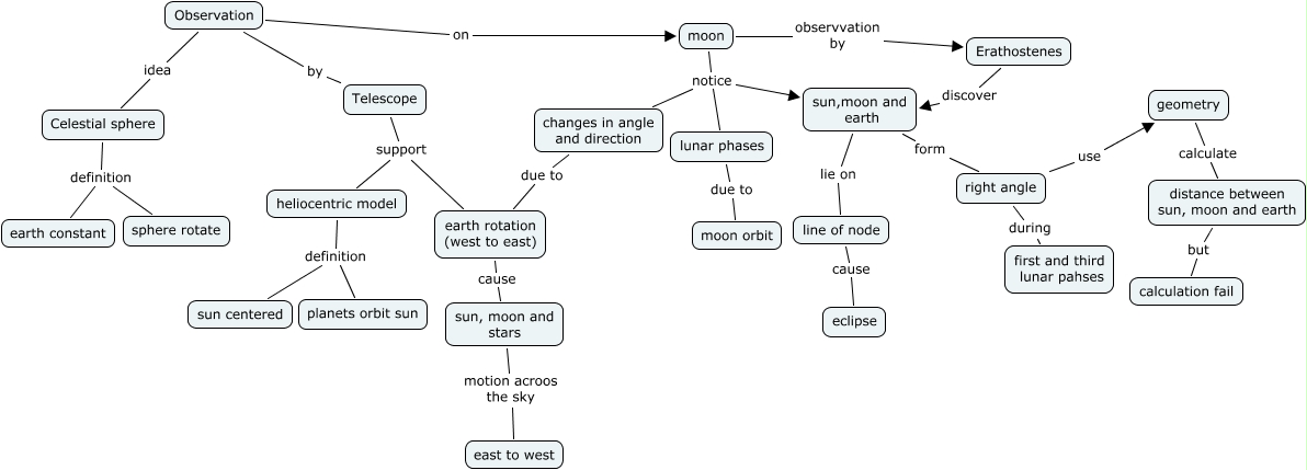This Concept Map, created with IHMC CmapTools, has information related to: Observation on sun and moon (Jc Ong), Celestial sphere definition sphere rotate, sun,moon and earth lie on line of node, right angle use geometry, lunar phases due to moon orbit, moon observvation by Erathostenes, moon notice sun,moon and earth, heliocentric model definition sun centered, Observation idea Celestial sphere, sun,moon and earth form right angle, changes in angle and direction due to earth rotation (west to east), Telescope support earth rotation (west to east), sun, moon and stars motion acroos the sky east to west, moon notice lunar phases, moon notice changes in angle and direction, right angle during first and third lunar pahses, Erathostenes discover sun,moon and earth, line of node cause eclipse, Celestial sphere definition earth constant, earth rotation (west to east) cause sun, moon and stars, heliocentric model definition planets orbit sun