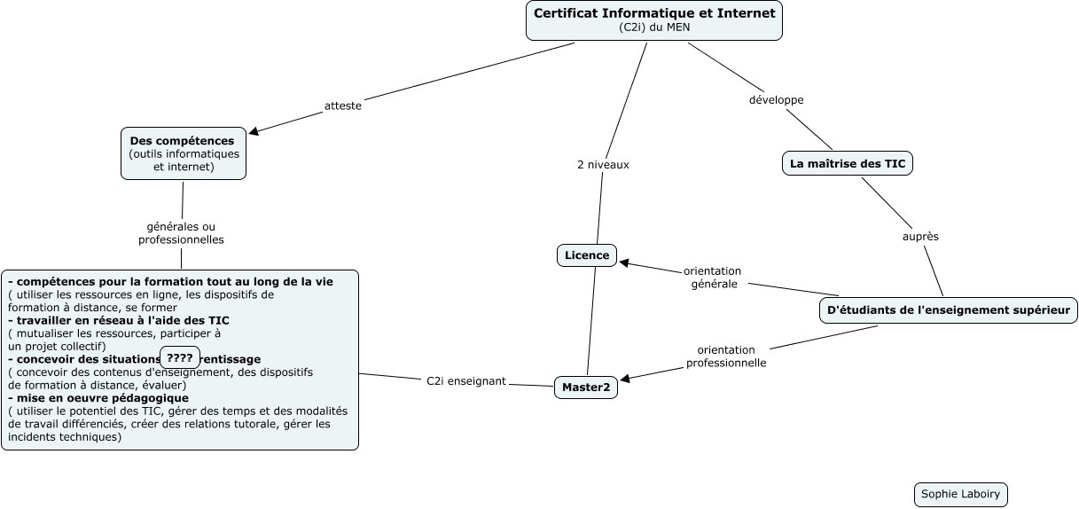 Cette carte de concepts créée avec IHMC CmapTools traite de: c2i_sophie_laboiry, Master2 C2i enseignant ????, D'étudiants de l'enseignement supérieur orientation professionnelle Master2, La maîtrise des TIC auprès D'étudiants de l'enseignement supérieur, Certificat Informatique et Internet (C2i) du MEN développe La maîtrise des TIC, Certificat Informatique et Internet (C2i) du MEN atteste Des compétences (outils informatiques et internet), Des compétences (outils informatiques et internet) générales ou professionnelles - compétences pour la formation tout au long de la vie ( utiliser les ressources en ligne, les dispositifs de formation à distance, se former - travailler en réseau à l'aide des TIC ( mutualiser les ressources, participer à un projet collectif) - concevoir des situations d'apprentissage ( concevoir des contenus d'enseignement, des dispositifs de formation à distance, évaluer) - mise en oeuvre pédagogique ( utiliser le potentiel des TIC, gérer des temps et des modalités de travail différenciés, créer des relations tutorale, gérer les incidents techniques), D'étudiants de l'enseignement supérieur orientation générale Licence, Certificat Informatique et Internet (C2i) du MEN 2 niveaux Master2