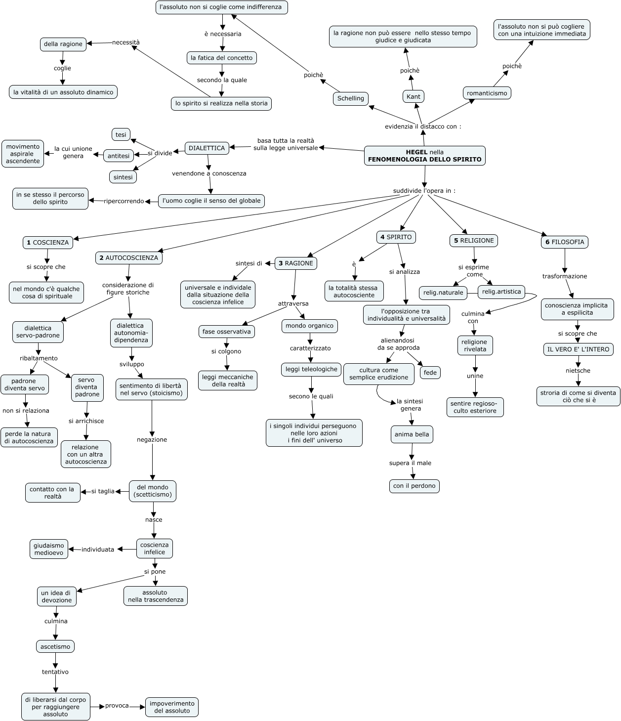 Questa Cmap, creata con IHMC CmapTools, contiene informazioni relative a: HEGEL, del mondo (scetticismo) si taglia contatto con la realtà, del mondo (scetticismo) nasce coscienza infelice, romanticismo poichè l'assoluto non si può cogliere con una intuizione immediata, della ragione coglie la vitalità di un assoluto dinamico, 1 COSCIENZA si scopre che nel mondo c'è qualche cosa di spirituale, l'assoluto non si coglie come indifferenza è necessaria la fatica del concetto, DIALETTICA si divide sintesi, HEGEL nella FENOMENOLOGIA DELLO SPIRITO suddivide l'opera in : 5 RELIGIONE, 4 SPIRITO è la totalità stessa autocosciente, DIALETTICA venendone a conoscenza l'uomo coglie il senso del globale, un idea di devozione culmina ascetismo, HEGEL nella FENOMENOLOGIA DELLO SPIRITO evidenzia il distacco con : Kant, HEGEL nella FENOMENOLOGIA DELLO SPIRITO suddivide l'opera in : 4 SPIRITO, coscienza infelice si pone assoluto nella trascendenza, dialettica servo-padrone ribaltamento servo diventa padrone, l'opposizione tra individualità e universalità alienandosi da se approda fede, HEGEL nella FENOMENOLOGIA DELLO SPIRITO suddivide l'opera in : 1 COSCIENZA, 3 RAGIONE sintesi di universale e individale dalla situazione della coscienza infelice, HEGEL nella FENOMENOLOGIA DELLO SPIRITO evidenzia il distacco con : romanticismo, HEGEL nella FENOMENOLOGIA DELLO SPIRITO evidenzia il distacco con : Schelling